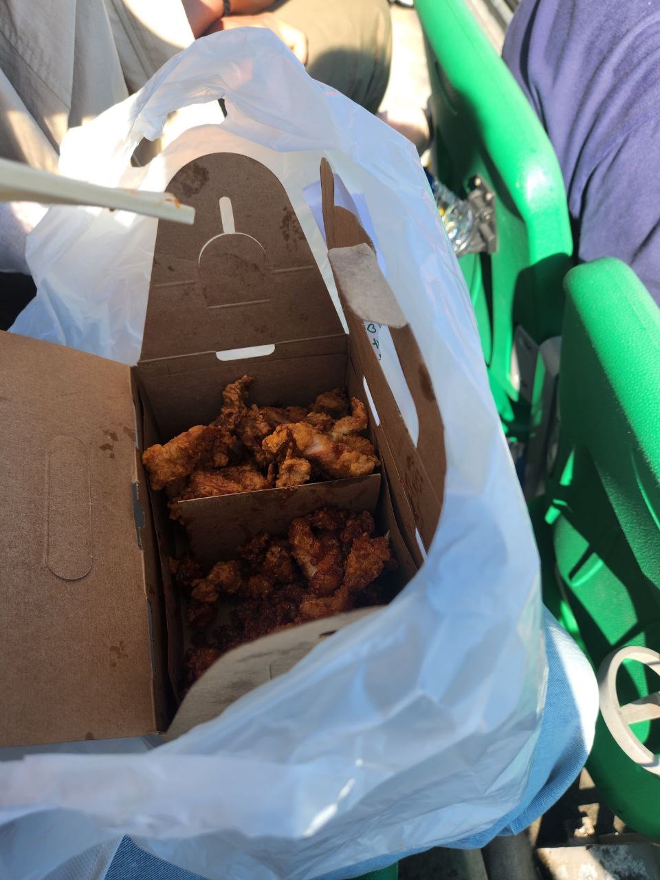 야구장에 가면 먹거리가 빠질 순 없죠. 이 날엔 사진으론 담지 않았지만 스타벅스의 카라멜 마키아또와 노랑통닭 반반치킨을 먹었습니다. 문학SSG랜더스 필드의 노랑통닭은 순살로만 판매하고 있고, 미리 튀기고 포장까지 마친 치킨들이 꽤 있어 결제하자마자 바로 수령 할 수 있습니다.