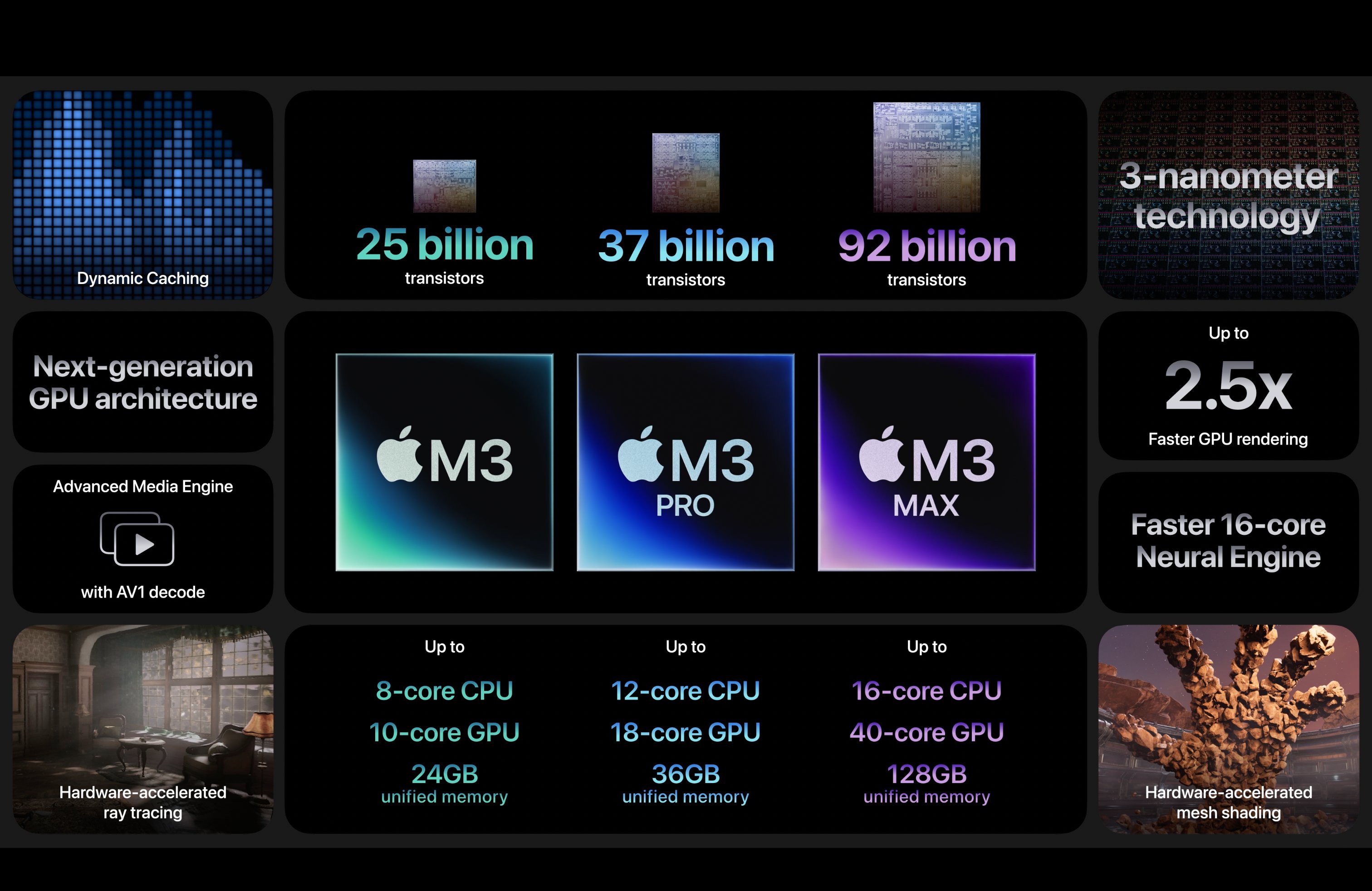 일단 가장 먼저 공개된 것은 M3시리즈 칩들입니다. 3나노미터급으로 제작되었다고 하지요.
