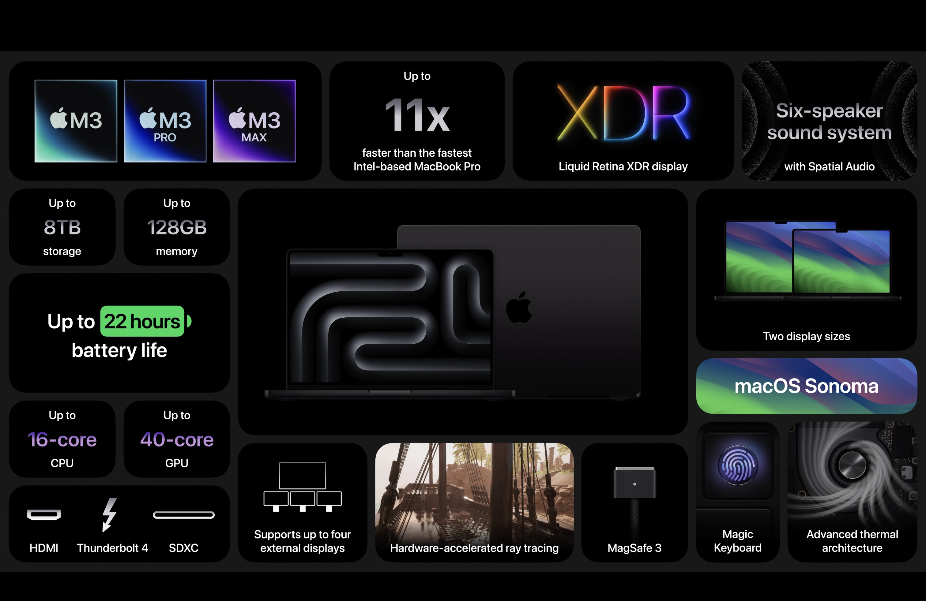 그리고 이어서 공개된 것은 맥북프로입니다. M3칩들이 장착된 맥북프로 시리즈입니다. 14인치와 16인치 모델로 판매가 될 예정입니다. 13인치 모델의 이야기는 없었습니다. 스페이스 블랙 색상이 새로 추가가 되었고 배터리 시간은 최대 22시간까지 간다고 합니다.