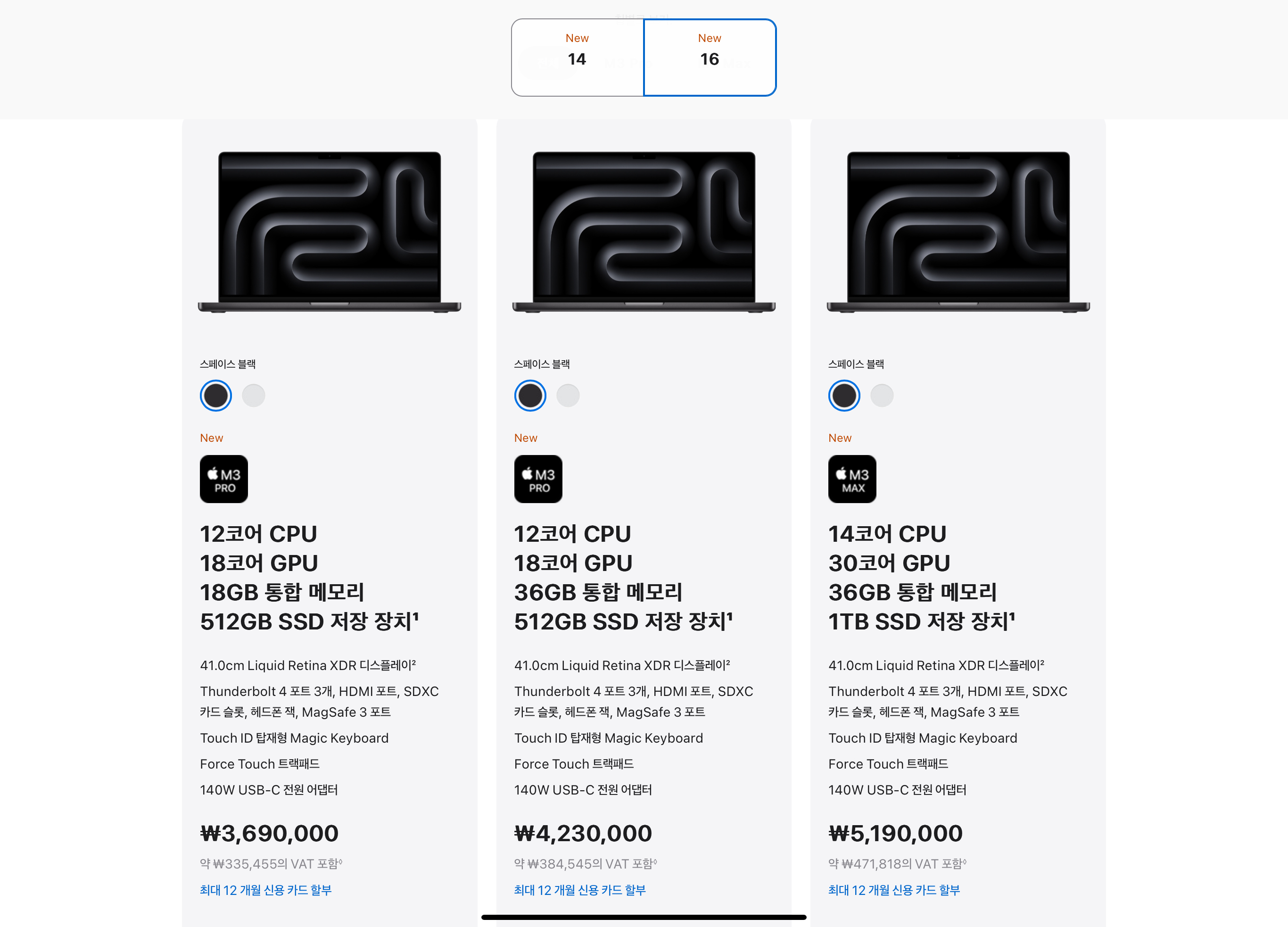 14인치 프로 모델은 239만원부터, 16인치 프로 모델은 M3 PRO 모델은 369만원부터, M3 MAX 모델은 519만원부터 시작하는것으로 나와있었습니다.