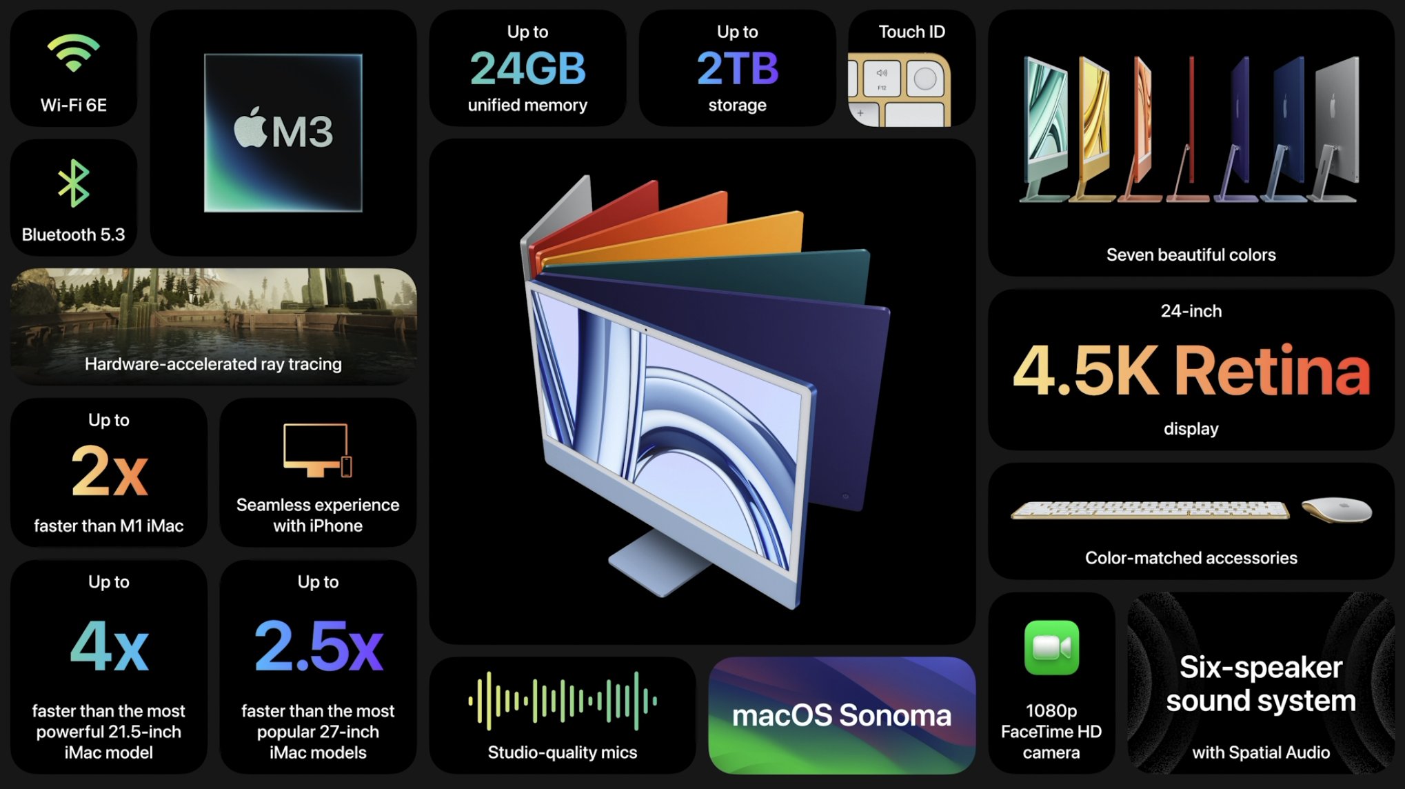 마지막으로 발표된 내용은 아이맥이었습니다. M1 아이맥 이후로 오랫동안 신제품 공개가 없었습니다만, 이번에 M3칩 탑재로 신 모델이 나왔습니다. M3칩 장착과 함께 4.5k 레티나 디스플레이 장착, 와이파이6E, 블루투스 5.3, 최대 24GB 메모리와 2TB저장 공간이 제공된다고 합니다.
