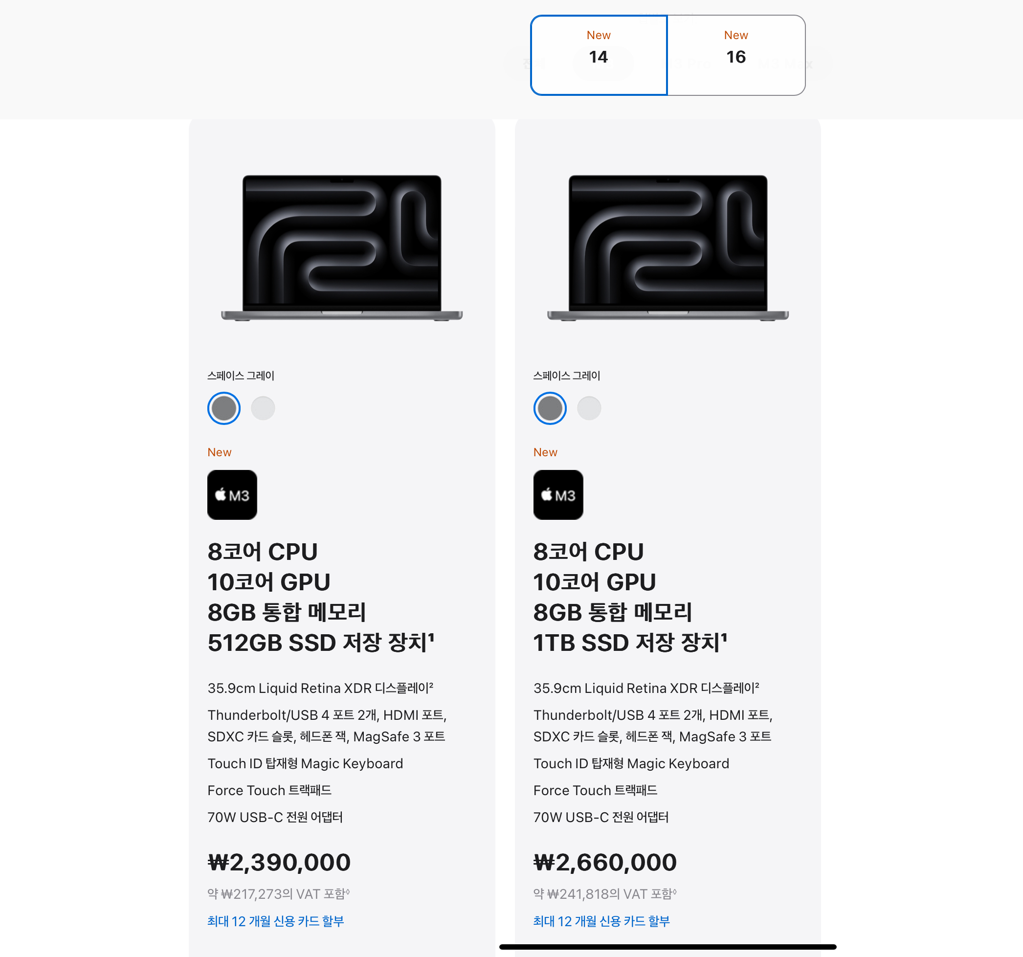 일단 14인치 프로는 M3칩만 들어가고, 16인치 프로엔 M3 PRO, MAX칩이 장착되는 것으로 구분이 되어 있습니다.