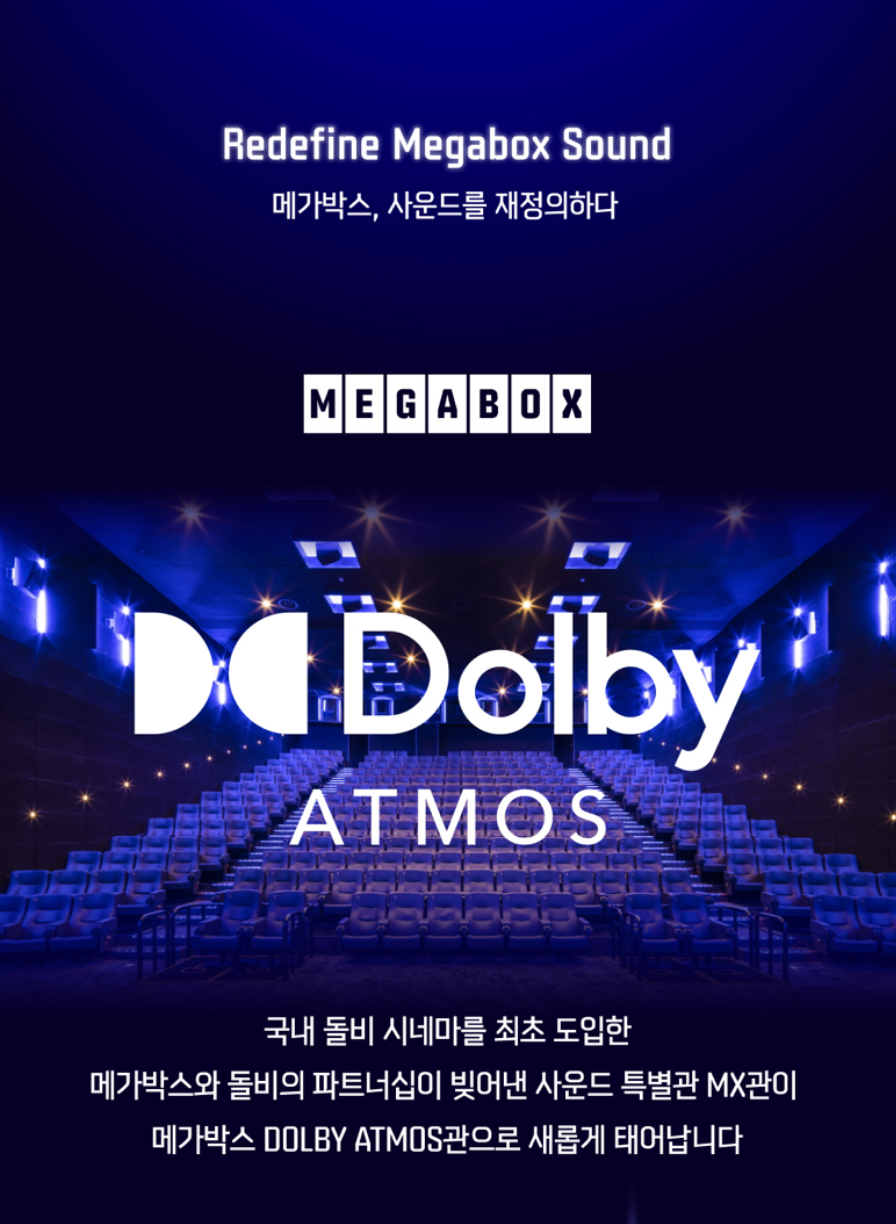 올 해 수원역 메가박스에 돌비시네마관을 도입하여 현재까지 총 6곳의 돌비시네마관을 론칭했습니다. 이 외에 11월부터 기존에 있던 MX관의 명칭을 '돌비 애트모스'관으로 리브랜딩을 했습니다.