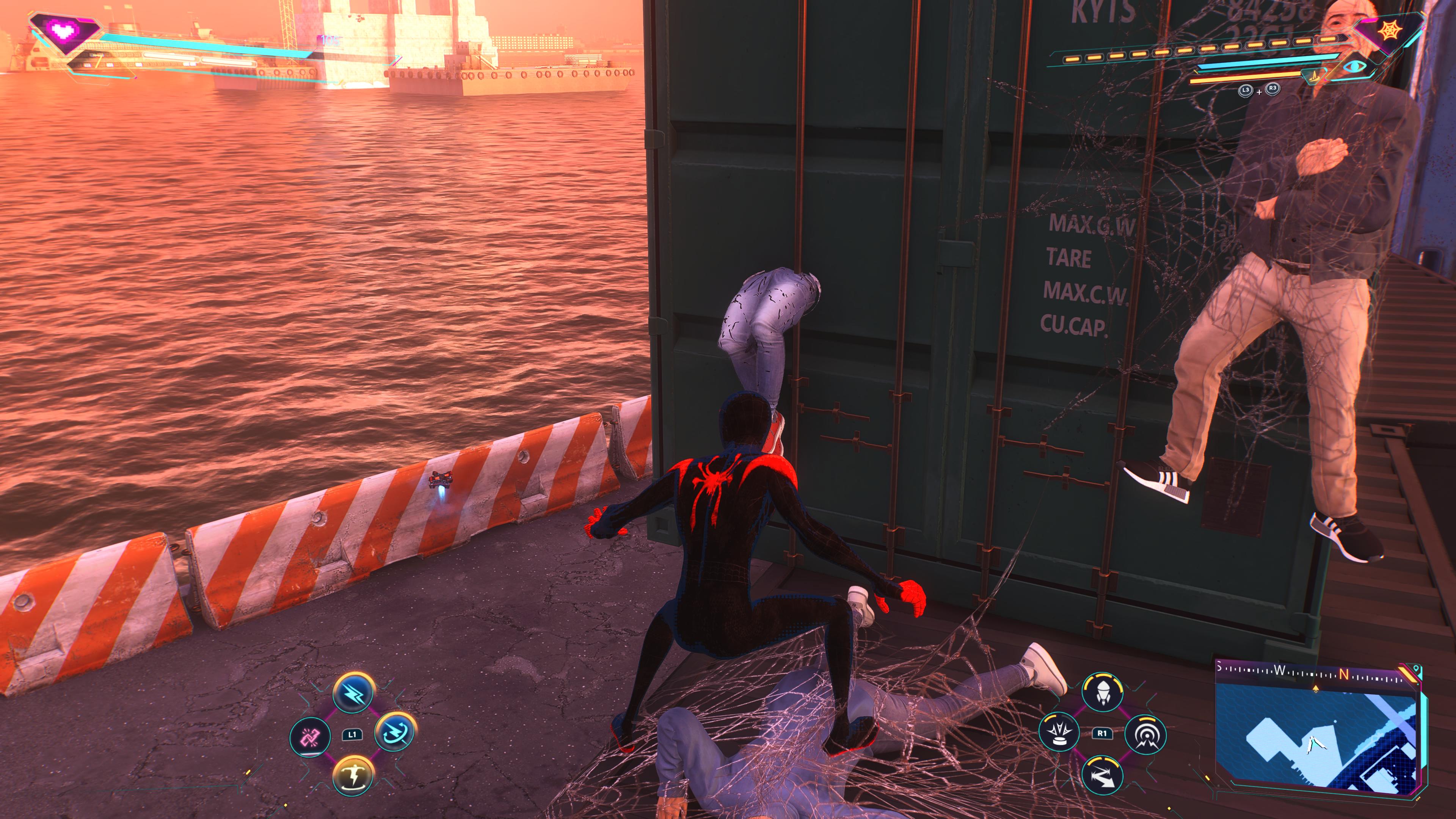 그렇지만 장점만 있진 않았습니다. 잔잔한 버그들을 종종 겪었습니다. 맵 상에 있는 사람들이 건물에 끼는 일은 이제 스파이더맨 게임 시리즈의 전통입니다. 건물에 사람이 끼는 버그는 정말 자주 봤습니다. 그리고 더이상 진행이 불가능한 버그도 2,3번 정도 겪었습니다. 메뉴창을 띄우고 마지막 체크포인트로 돌아가서 다시 플레이를 하니 그 때서야 정상적으로 다음으로 진행을 할 수 있었습니다.