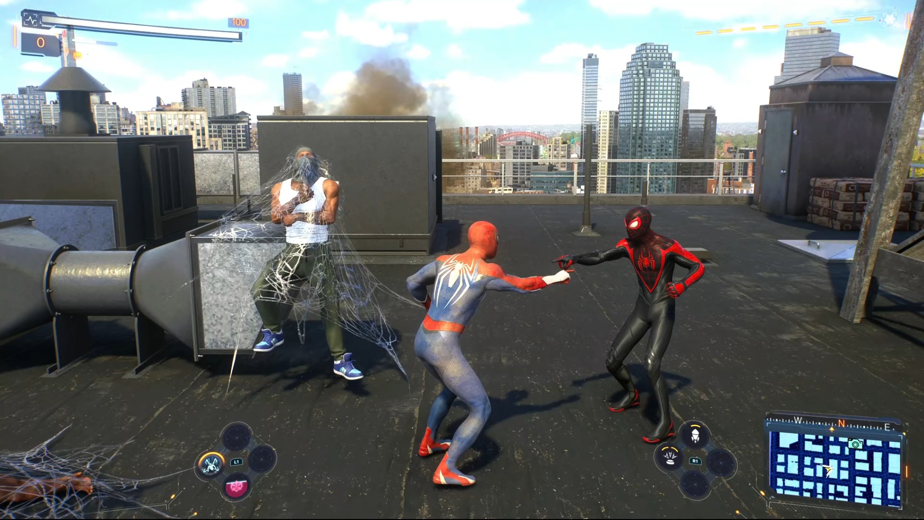 1편에서도 전투와 액션은 정말 훌륭했습니다. 공격 버튼은 네모 버튼 하나가 주된 공격 버튼이지만 상황에 맞게 다른 기술들이 적용이 되었지요. 이번에도 기본적인 전투 방식은 비슷합니다. 하지만 더 기술이 많아졌습니다. 직관적으로 L1, R1버튼을 통하여 스파이더맨의 고유 기술과 특수 장비를 활용한 기술 적용은 더더욱 전투를 재밌게, 맛깔나게 할 수 있도록 해줍니다. 특히 스파이더맨이 두 명이 된 만큼 스킬 포인트를 누구에게 먼저 투자할 것인지 전략을 생각하게 하는 요소가 많아졌습니다.