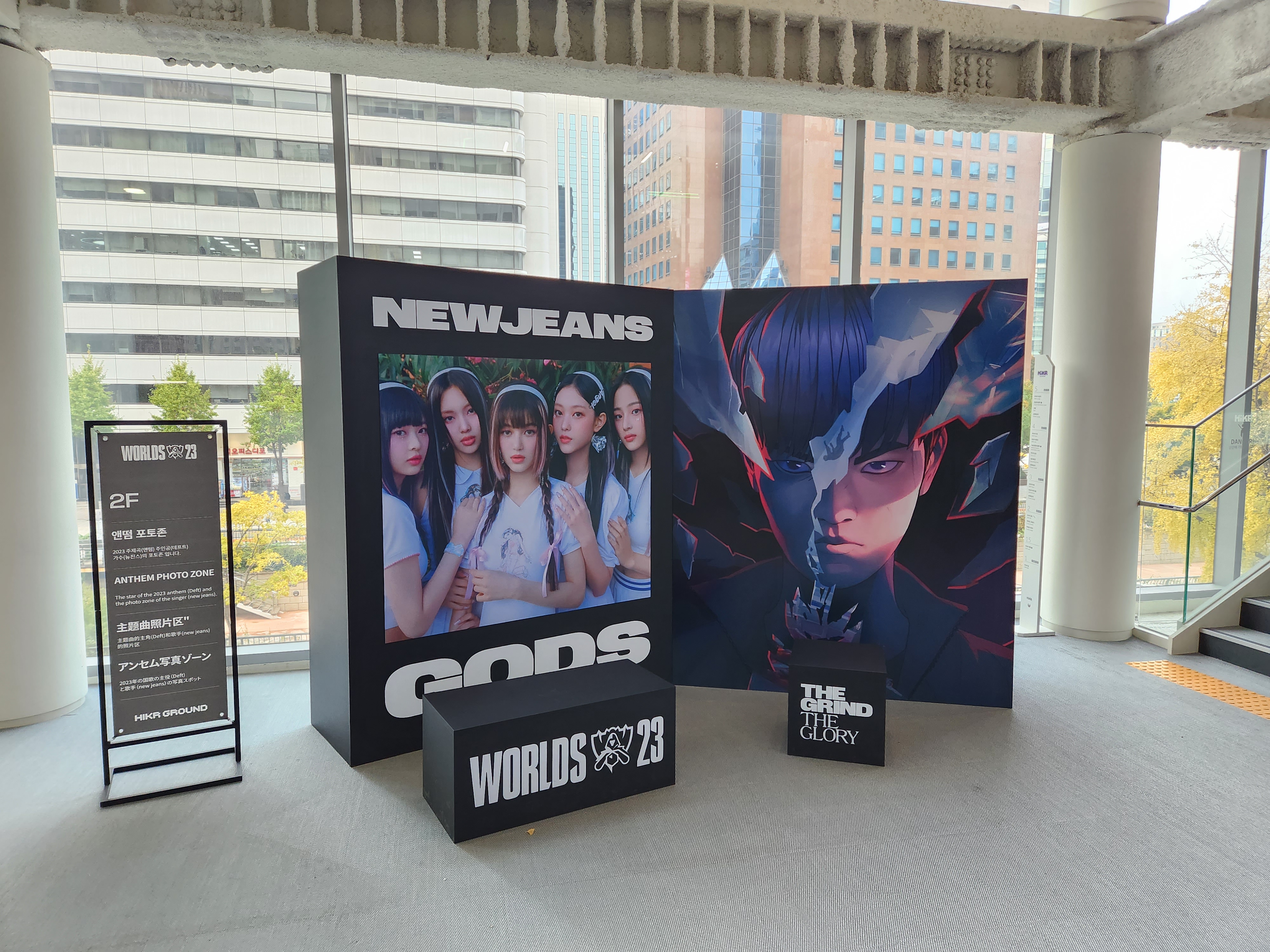 그리고 이번 롤드컵 주제가인 뉴진스의 Gods를 기념하는 포토존이 있습니다.