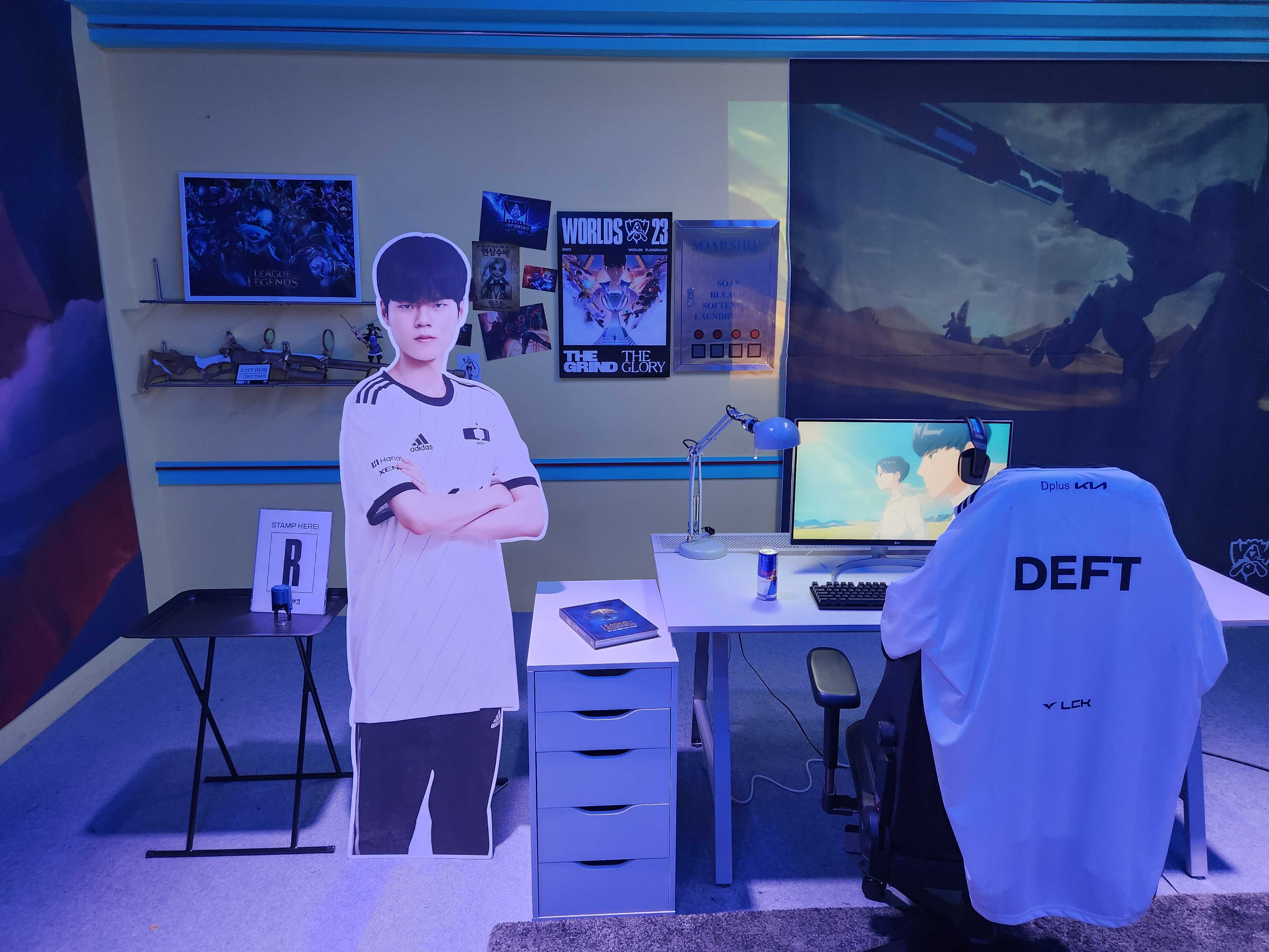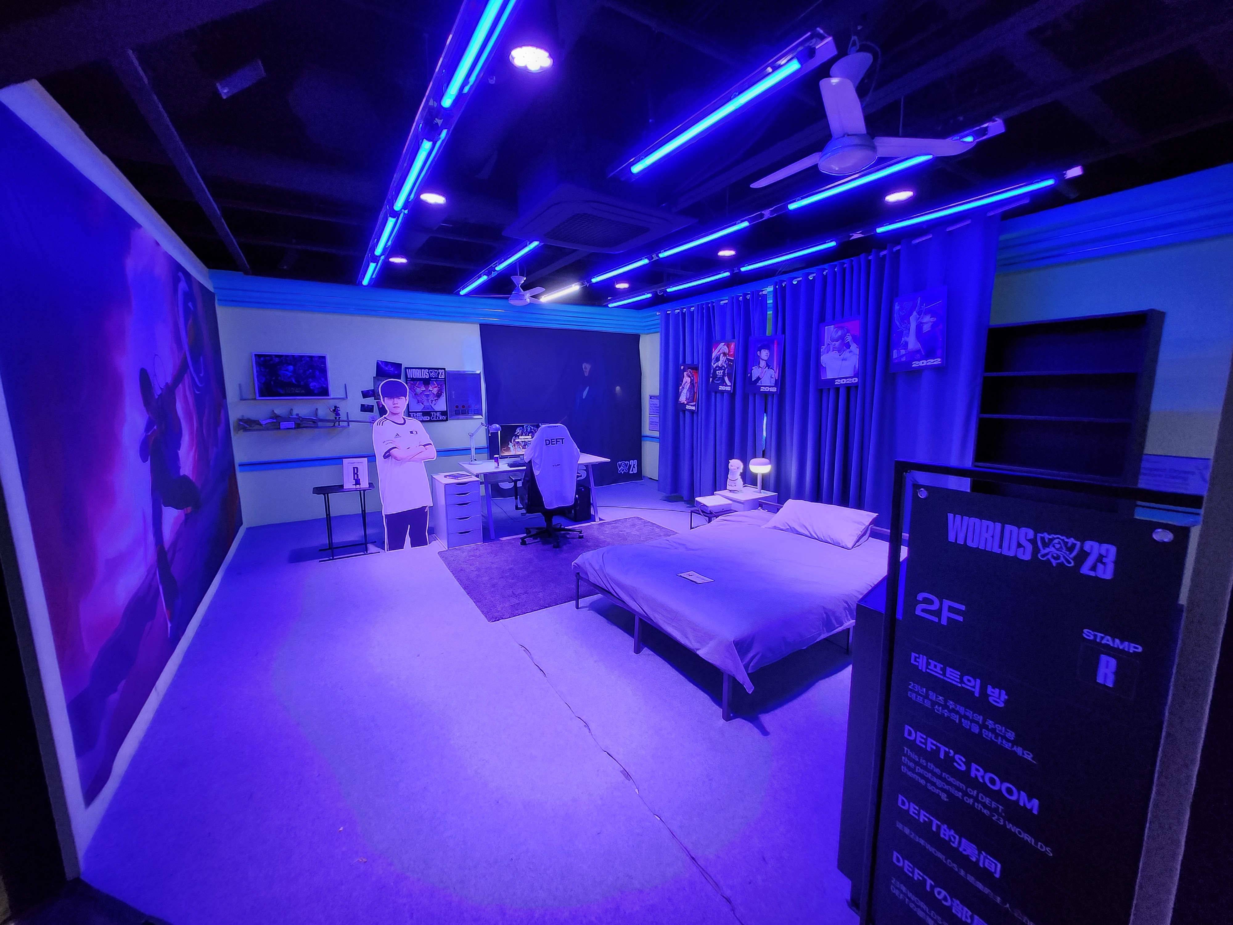 그 다음에는 본격적으로 여러 체험 부스, 전시 코스가 있었습니다. 가장 먼저 보이는 곳은 이번 공식 주제가인 GODS의 주인공 데프트 선수의 방을 재현한 공간입니다. 리그 오브 레전드와 관련된 물품들로 꾸려진 방입니다. 여기서부터 본격적으로 도장을 찍기 시작합니다.