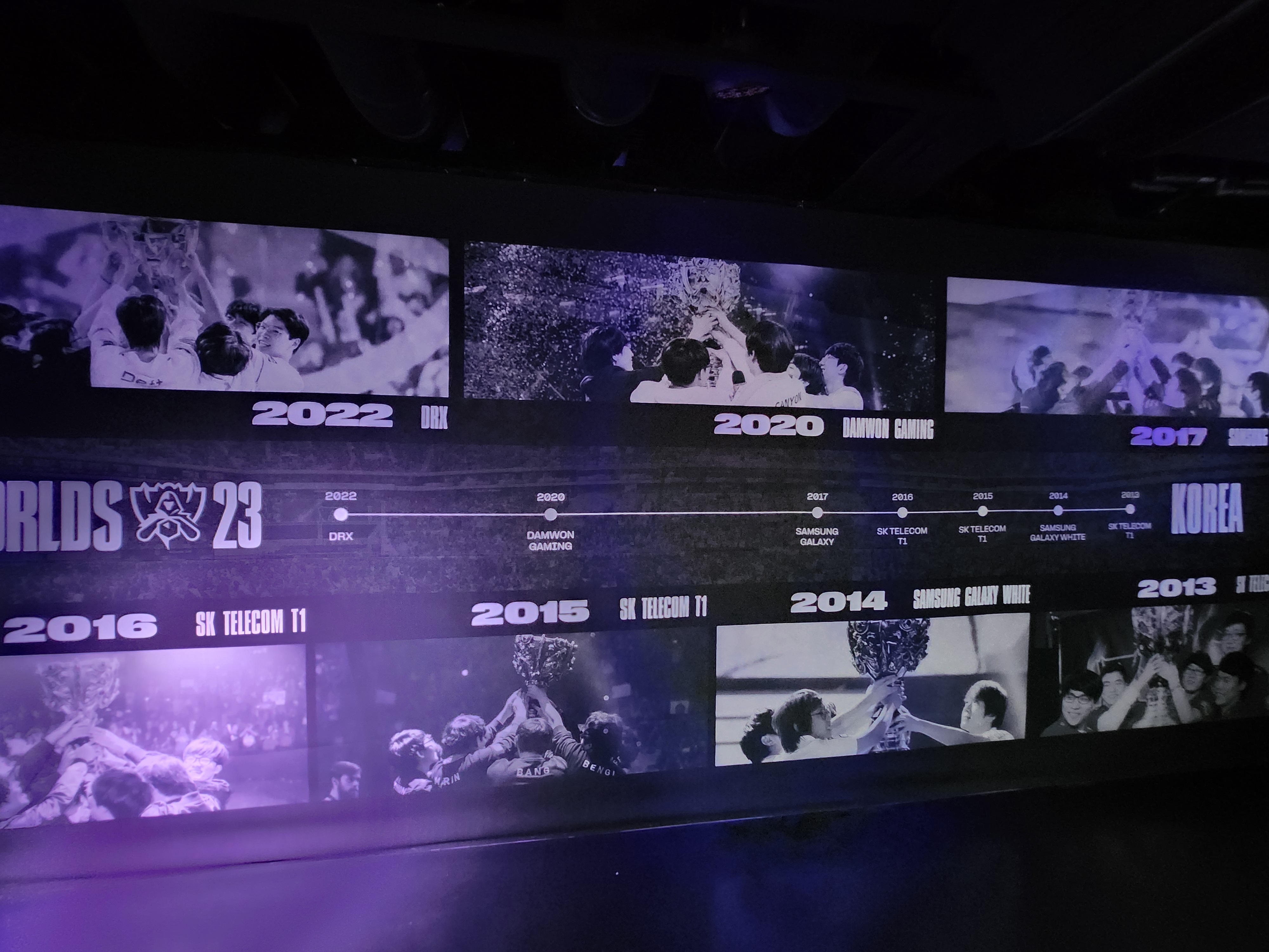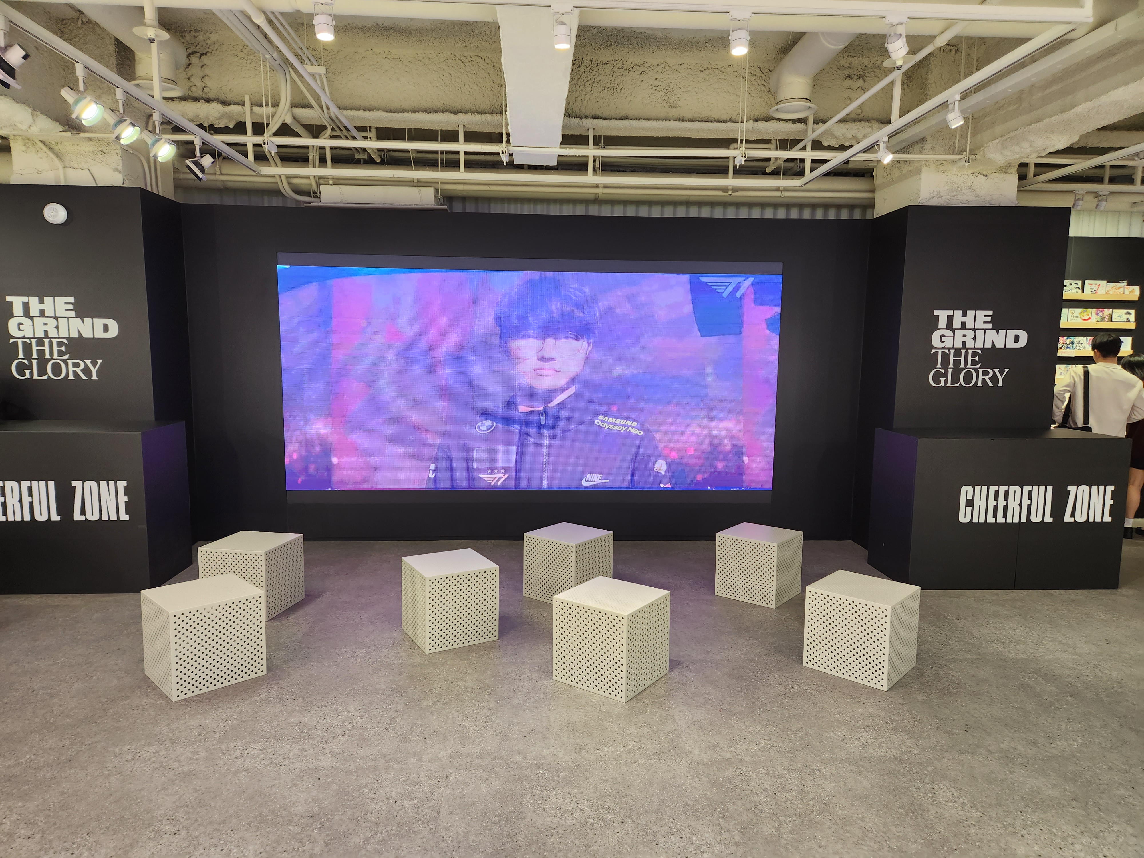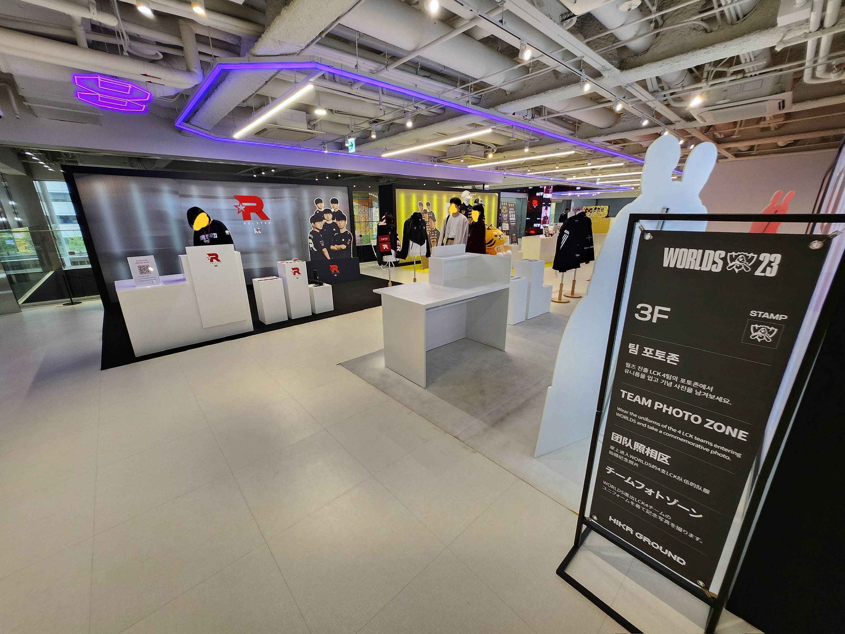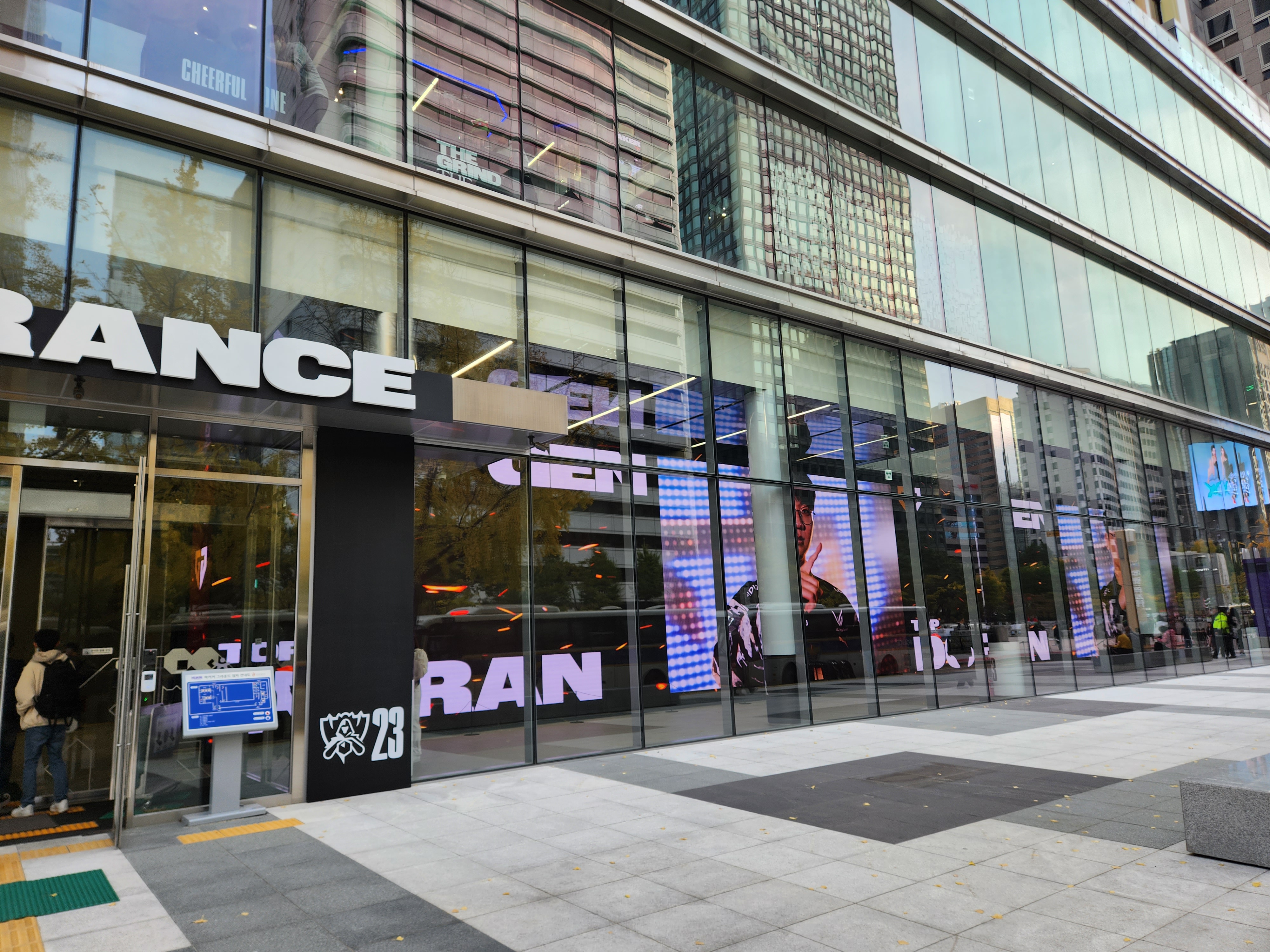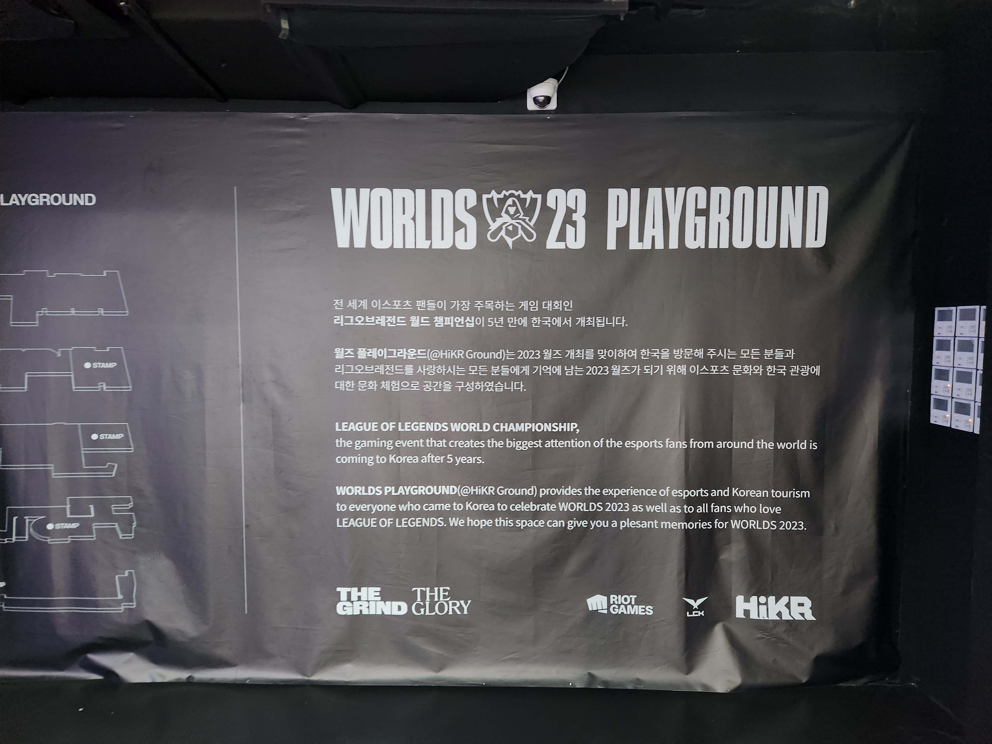 하이커그라운드 외관. 밖에서부터 이 곳은 롤드컵 월즈23의 전시가 열리고 있다는 것이 느껴지지요. 안으로 들어가시면 이번 월즈에 진출한 LCK의 4팀의 소개 영상이 거대한 전광판을 통해서 나오고 있습니다.