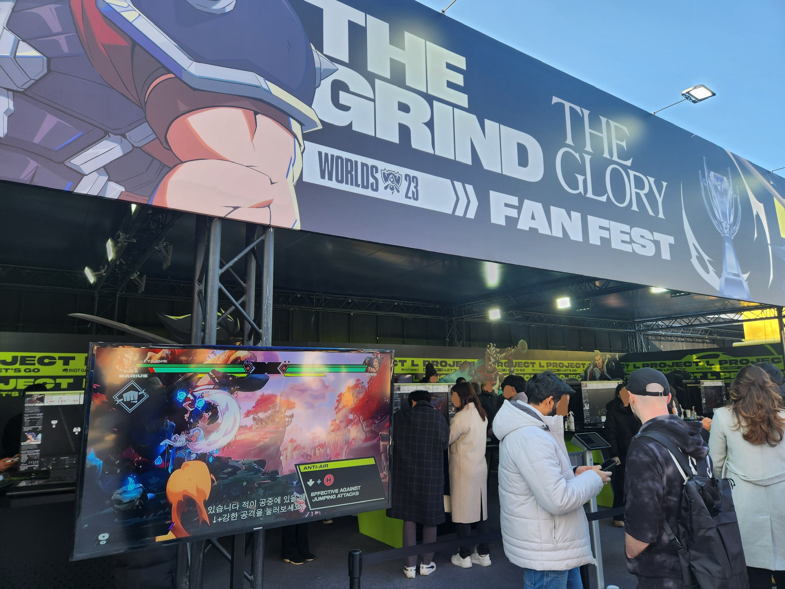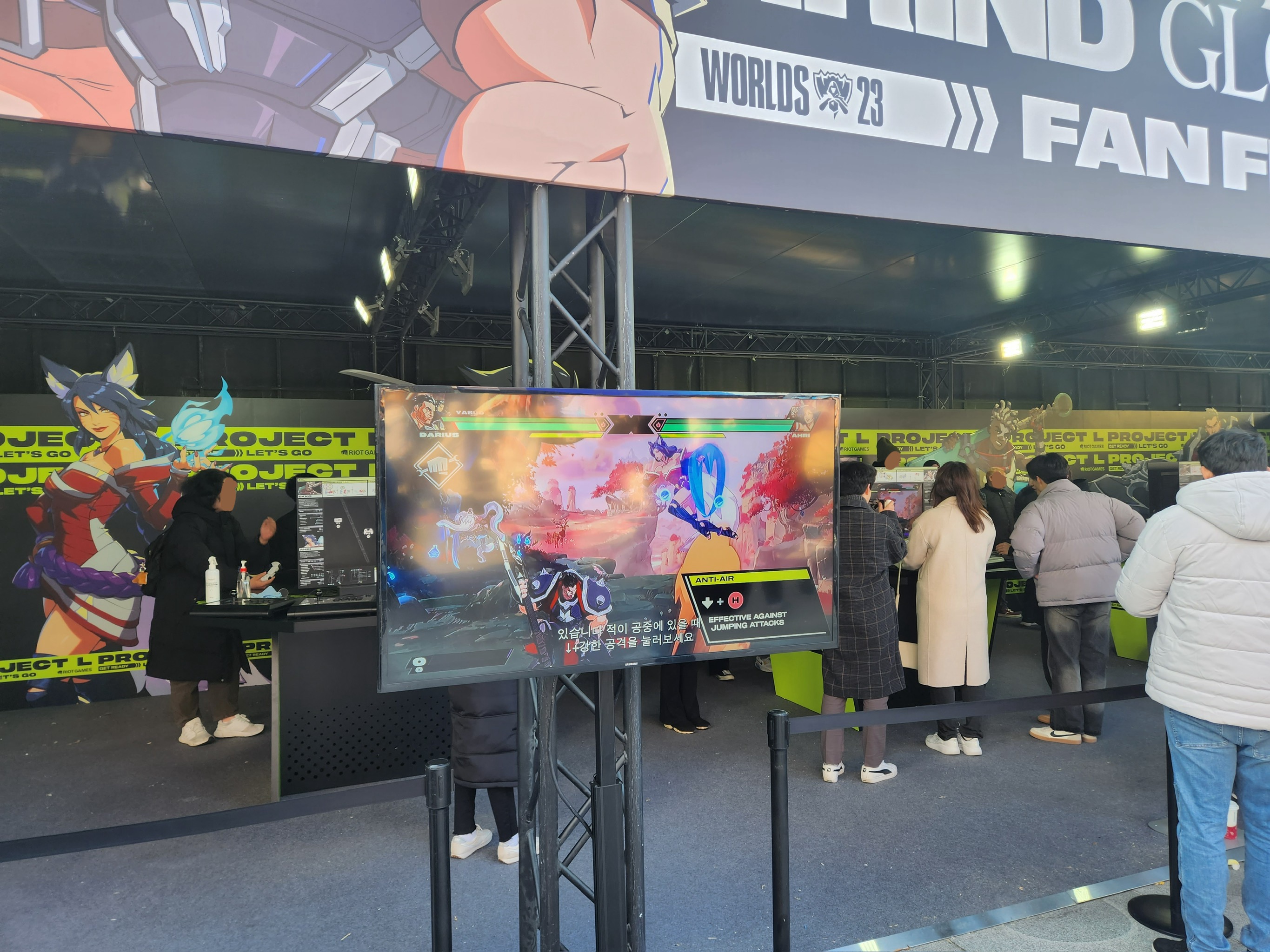 일단 라이엇게임즈에서 새로 출시한 신규 격투게임 체험구역이 있었습니다. 그런데 토요일 추운 날씨 속에서도 정말 많은 분들이 현장에서 대기를 하고 계셨습니다. 제가 간 시간대는 오후 2시 이후였는데 그 때는 1시간 이상을 대기해야 한다고 하더라구요.