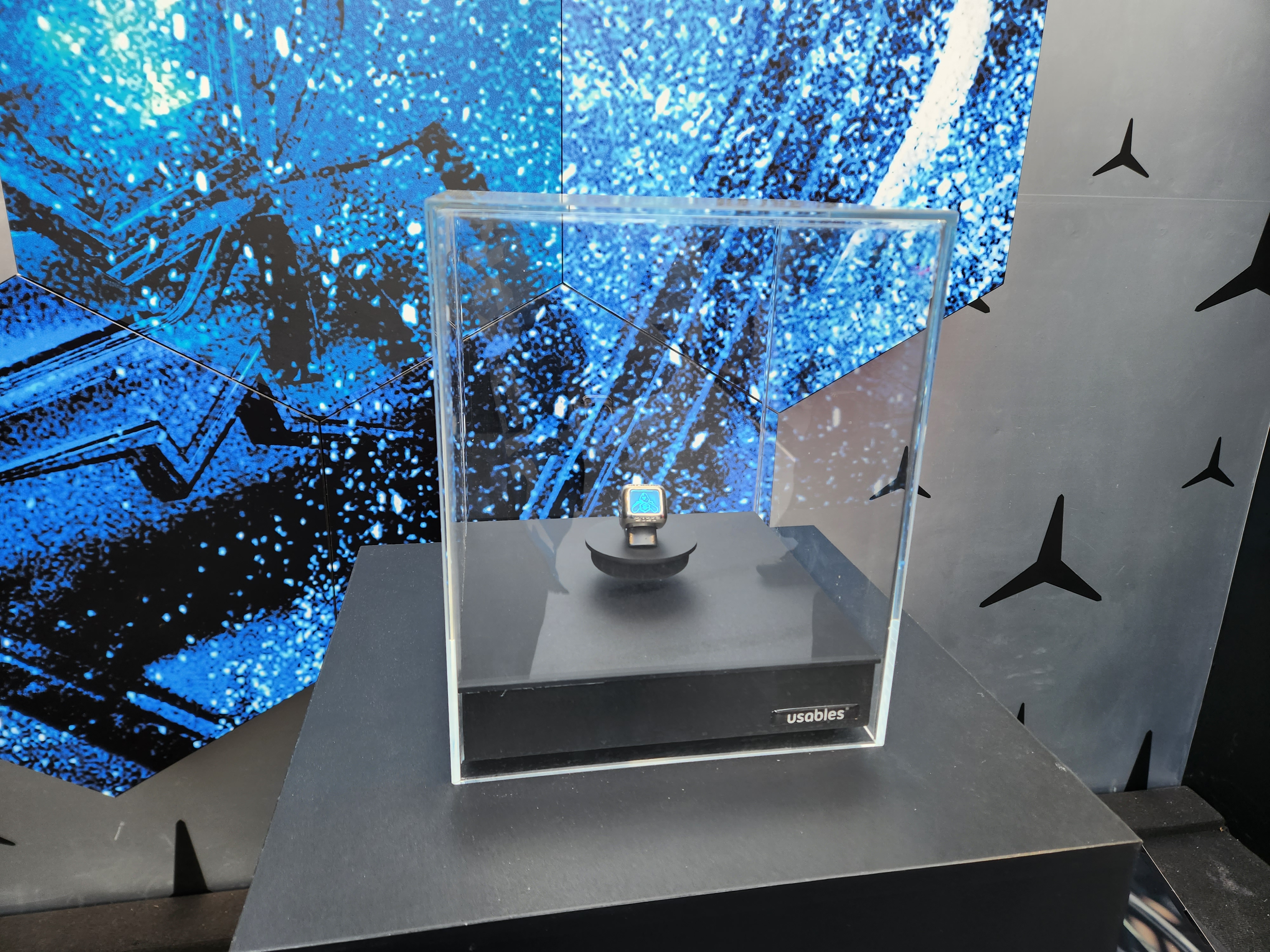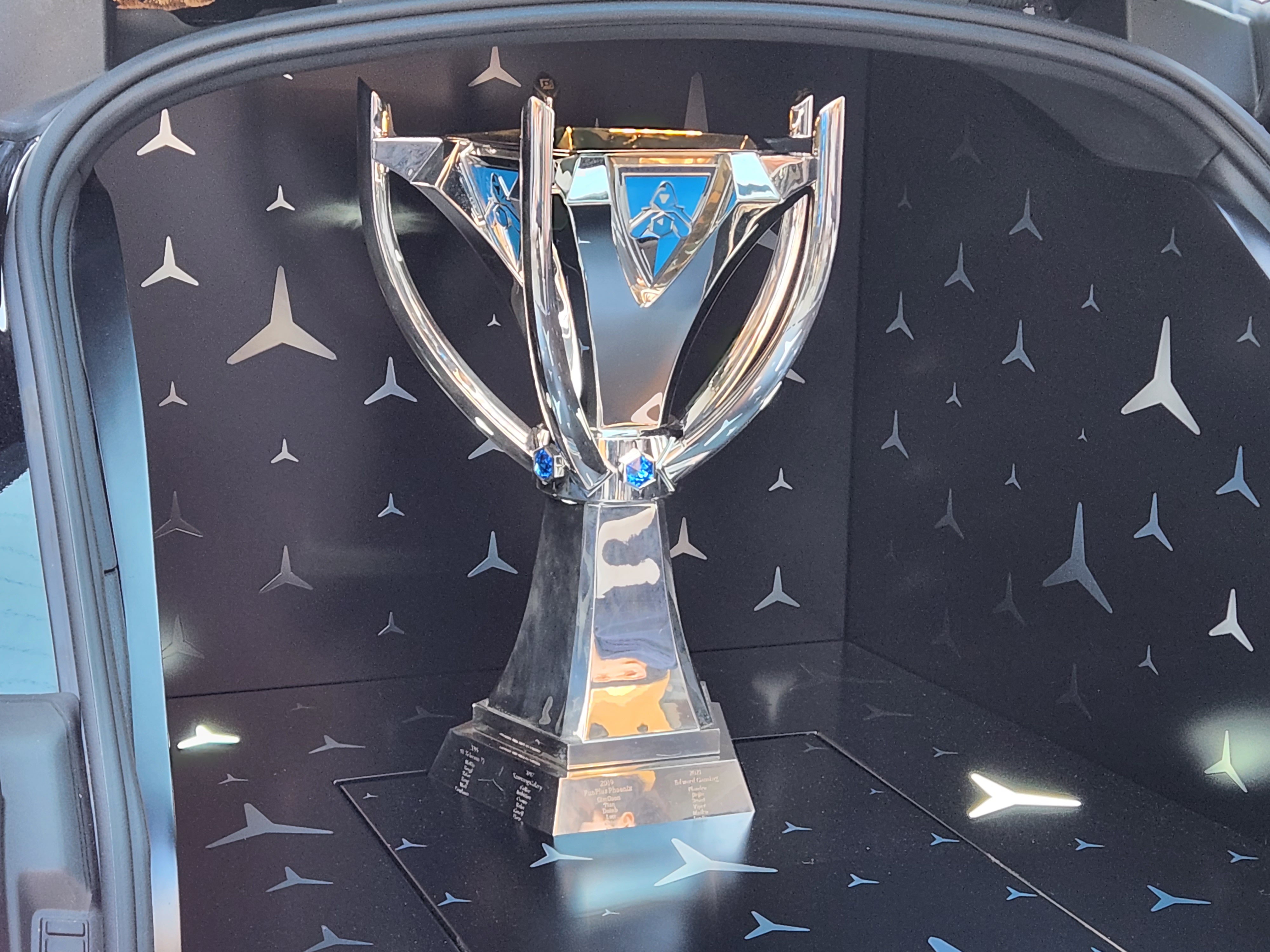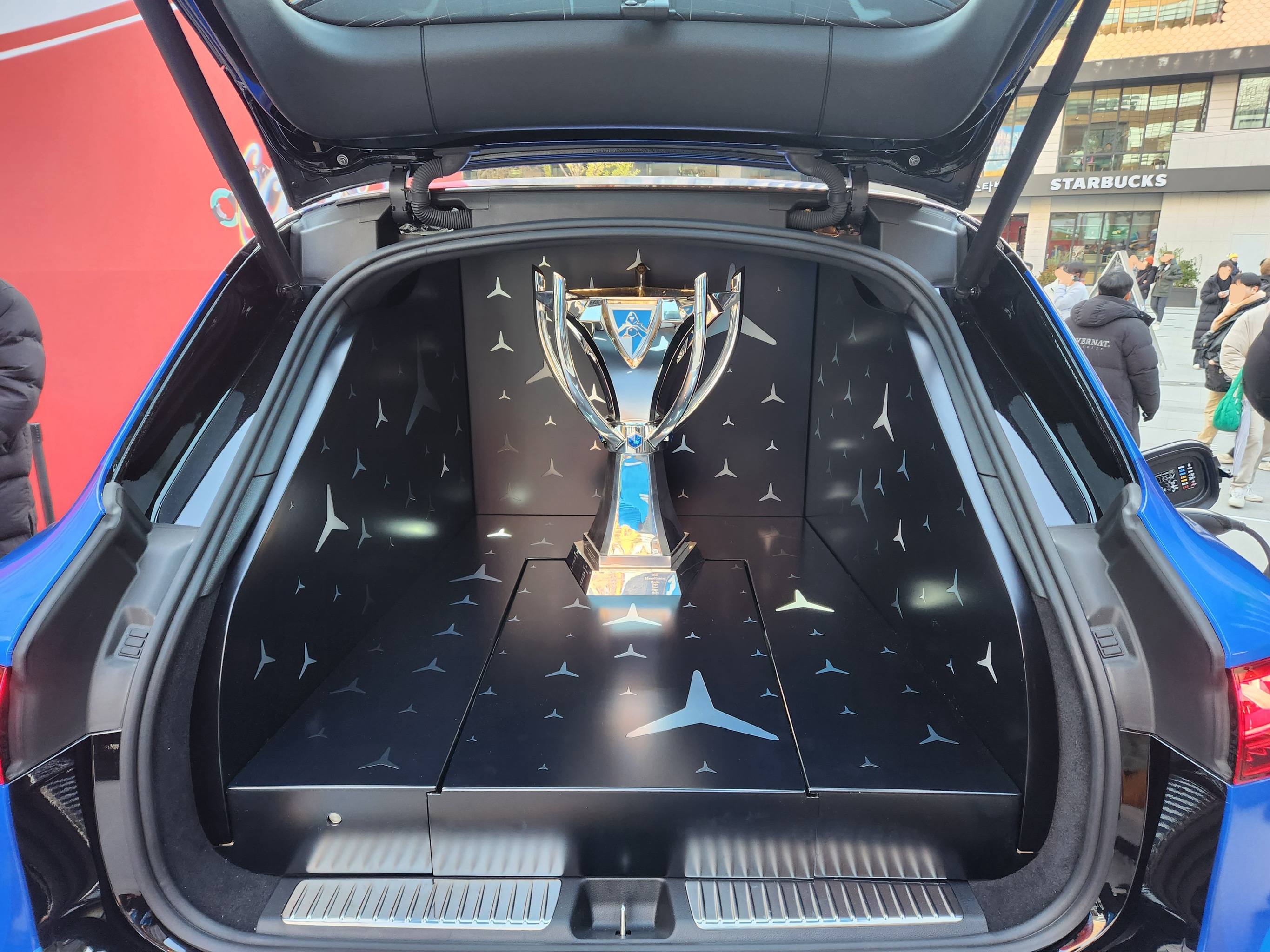 메르세데스 벤츠 부스엔 전기차와 롤드컵의 트로피인 소환사의 컵이 전시되어 있었습니다.