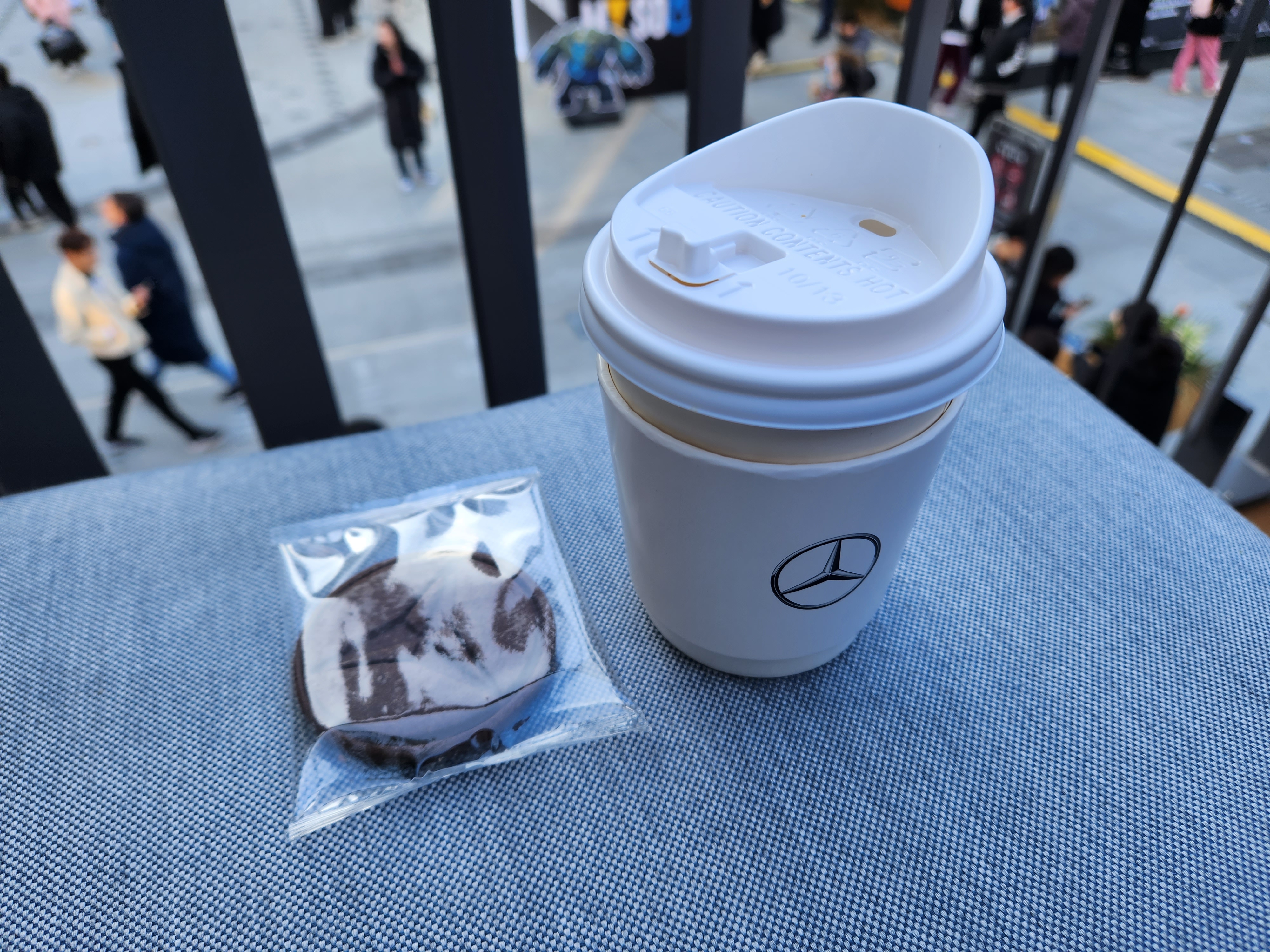 벤츠 부스 2층엔 이렇게 옥상정원처럼 무료로 커피와 쿠키를 나눠주고 앉아서 먹을 수 있도록 공간이 마련되어 있었습니다.