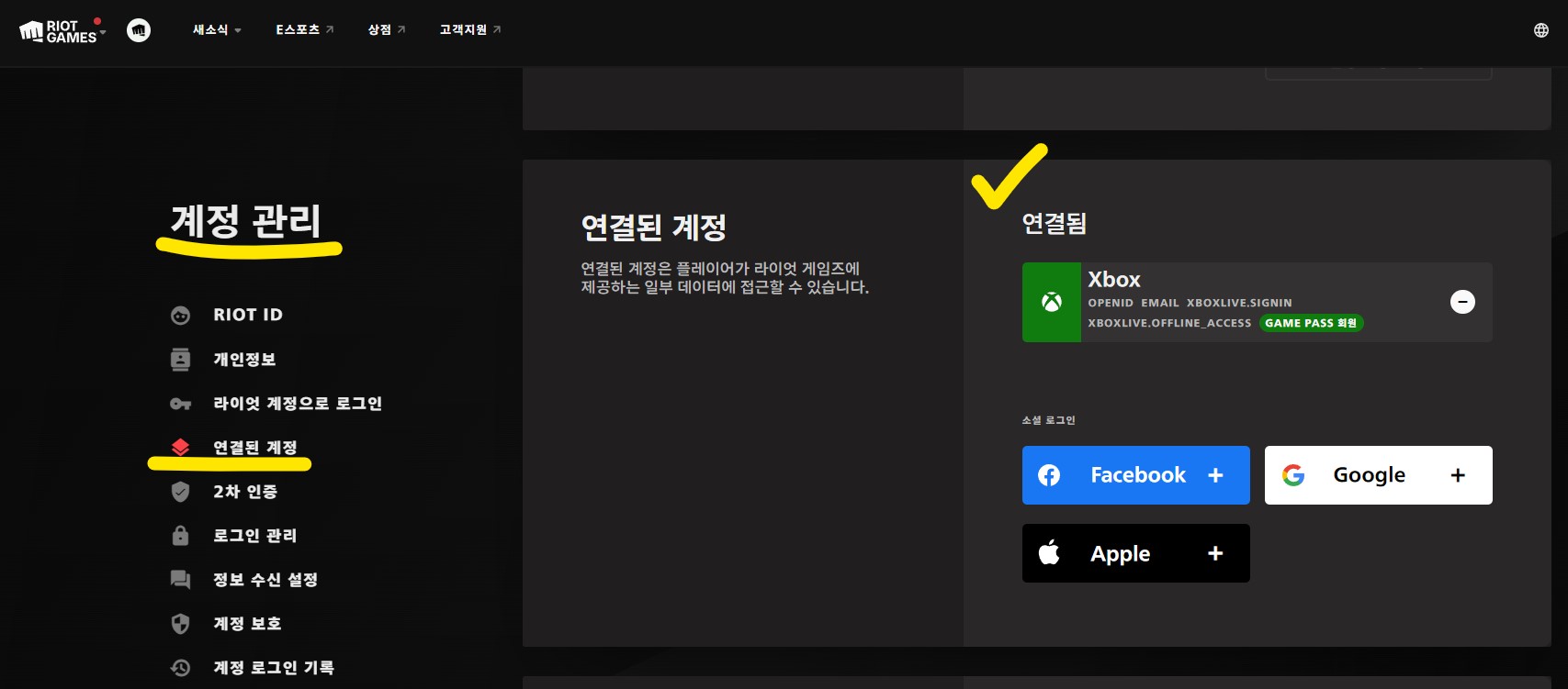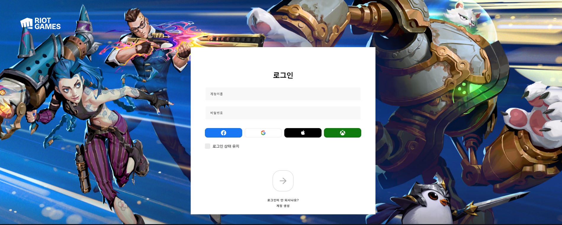 이번 글의 경우는 아주 옛날부터 원래 라이엇계정에 엑스박스 게임패스 계정을 연동하는 방식이니까 라이엇 게임즈에 직접 로그인해줍니다.