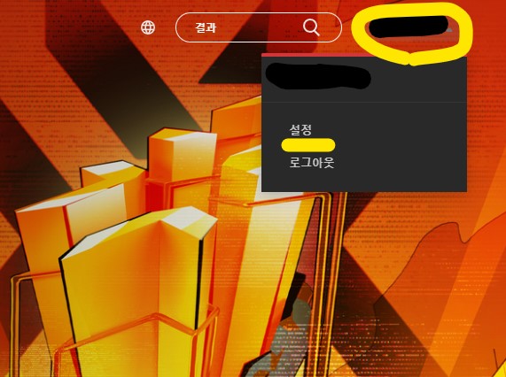 로그인을 하면 우측 상단에 여러분의 아이디가 보이실텐데요, 이걸 누르시고 설정을 클릭해 줍니다.