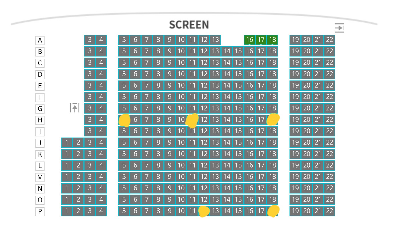 목동 돌비 애트모스관은 시네마스코프 비율의 상영관입니다. 코엑스 돌비시네마관과 유사한 구조이며 앞뒤로 굉장히 길게 좌석이 배치되어 있습니다. 무려 P열까지 좌석이 있고 한 줄에 최대 22명이 앉을 수 있습니다. 정 중앙 좌석은 11번, 12번 좌석입니다.