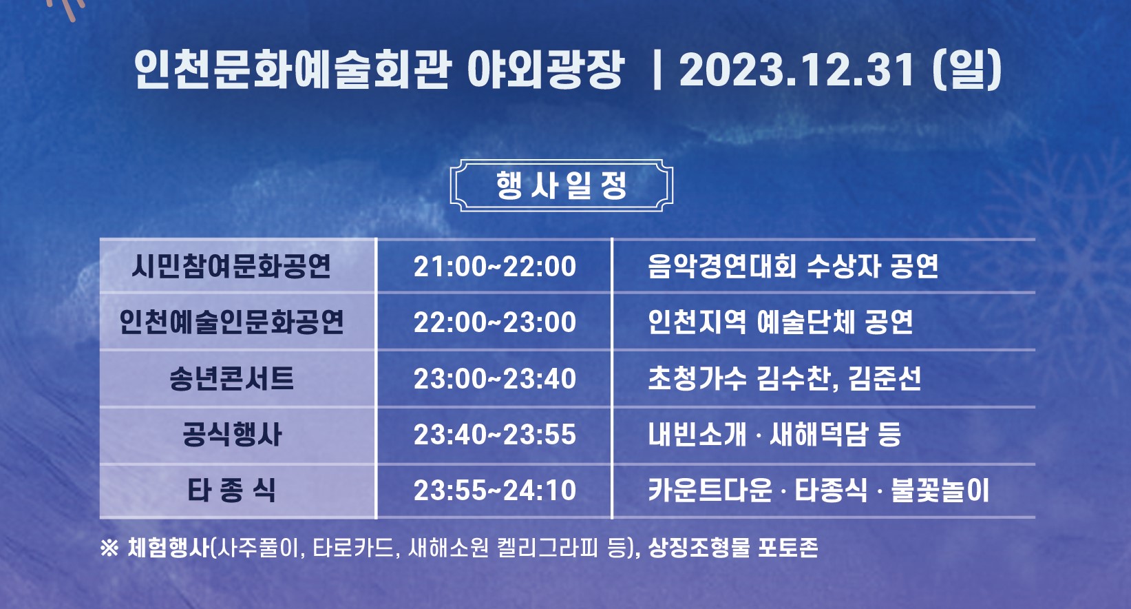 인천광역시, 예술회관 앞 야외광장에서 2023 송년제야 문화축제 개최 예정정보 2023. 12. 16. 06:56반응형