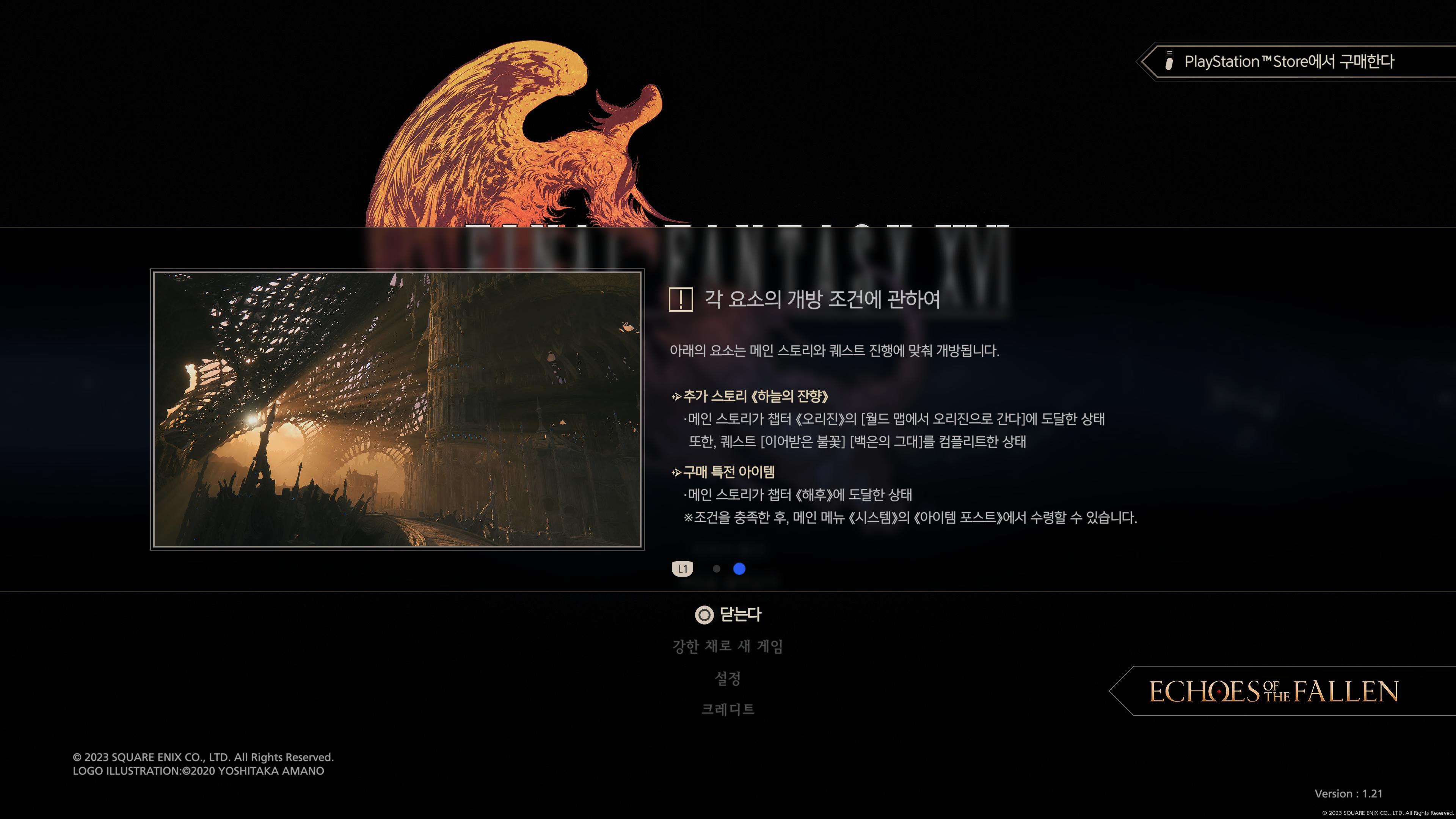 그리고 지난 12월 초, 더 게임 어워즈에서 파판16의 DLC 2개가 공개가 되었습니다. 그 중 첫 번째인 하늘의 잔향은 곧바로 출시가 되었고, 두 번째 DLC인 바다의 통곡은 2024년 봄에 발매가 될 예정이라고 하지요. 이번에 하늘의 잔향 dlc를 플레이 해봤습니다.