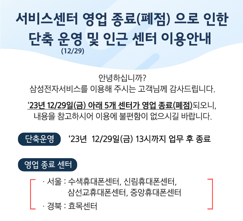 삼성전자의 서비스센터 일부 지점들이 2023년 12월 29일부로 폐쇄가 되었다는 소식입니다.