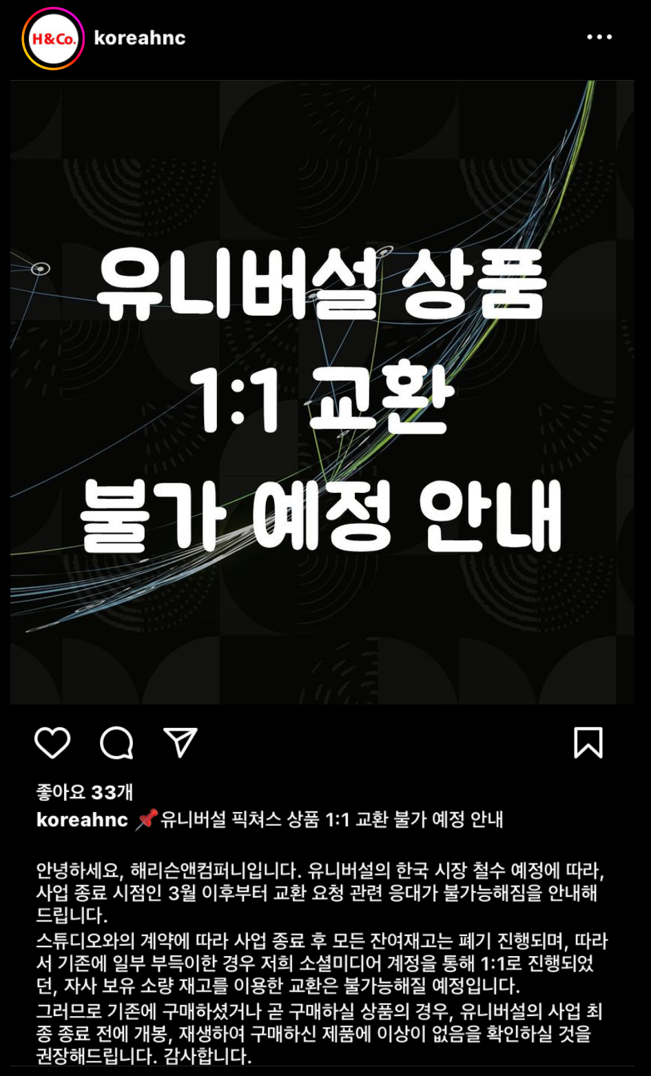 해리슨 컴퍼니의 인스타에서 공지된 내용입니다. 더이상 신제품이 발매되지 않는 상황에서 일부 부득이한 경우, 예를 들면 불량품이나 제작 과정에서 파손된 제품에 한해 보유 재고에서 1대1 교환을 해줬었는데요, 스튜디오와의 계약에 따라 3월 이후부턴 1대1 교환은 불가하고 해리슨컴퍼니에서 보유한 유니버셜 스튜디오의 블루레이 타이틀 재고들은 따로 판매 없이 전부 폐기가 진행될 예정이라고 합니다.