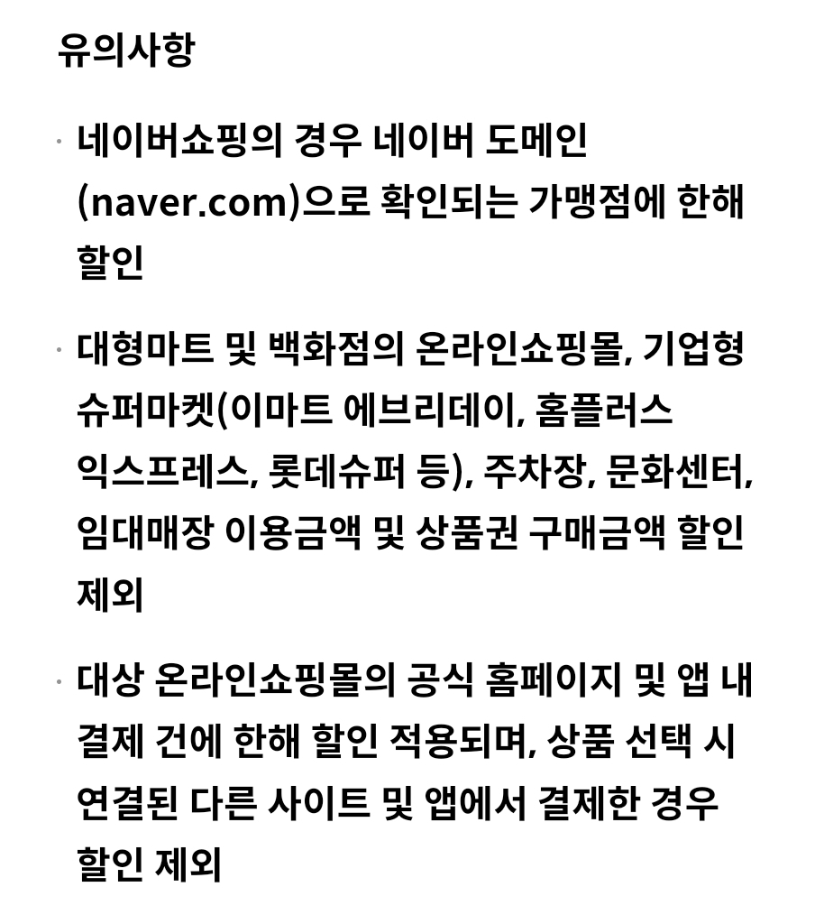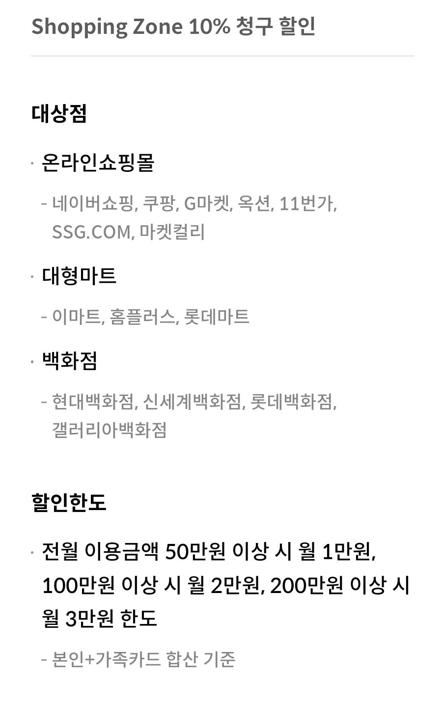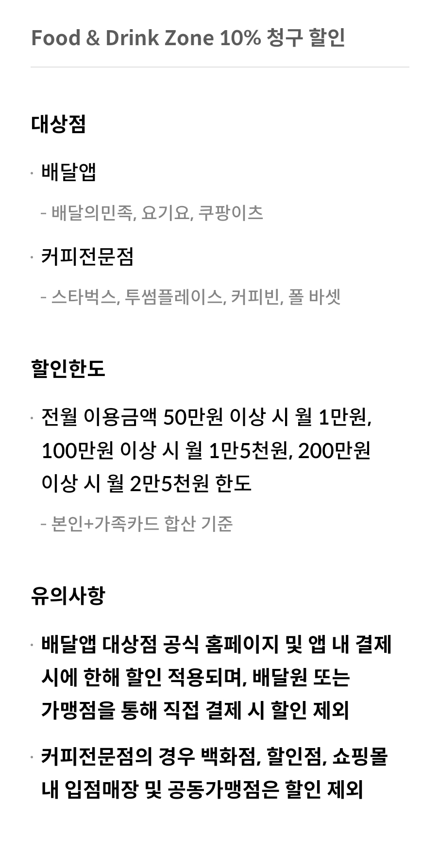 세 번째는 혜택에 적혀있는 영역과 자신의 소비영역이 맞아야 한다는 점입니다. 의외로 3영역을 모두 고르게 소비, 결제를 해야 최대 할인폭을 뽑아 낼 수 있는데 이게 생각보다 좀 까다롭습니다. 쇼핑의 영역은 인터넷 쇼핑몰이든, 오프라인이든 많은 곳에서 혜택이 적용되지만 푸드의 경우는 배달을 주로 시키지 않는다면 좀 어렵습니다. 소비를 위해서 나름 계산을 해야 한다는 점이 있습니다.