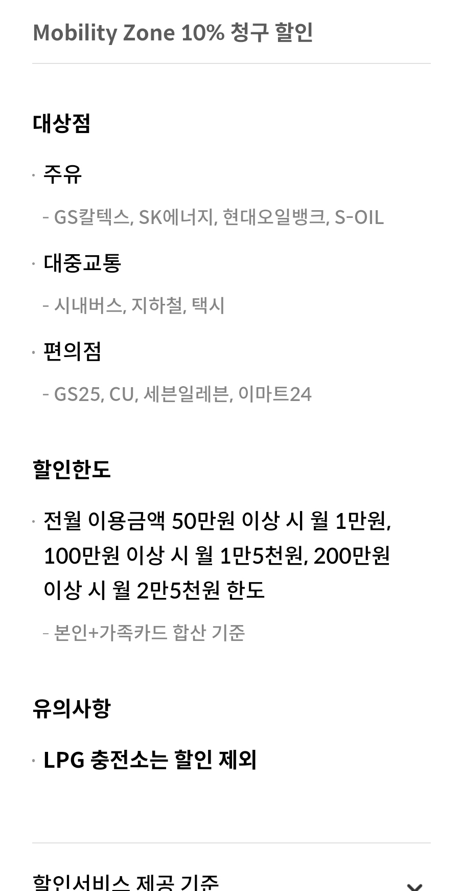 모빌리티의 경우는 주유소에서 주유할 때, 대중교통 (시내버스나 지하철이나 택시), 그리고 편의점(GS25, CU, 이마트24, 세븐일레븐)으로 나눠져 있습니다.
