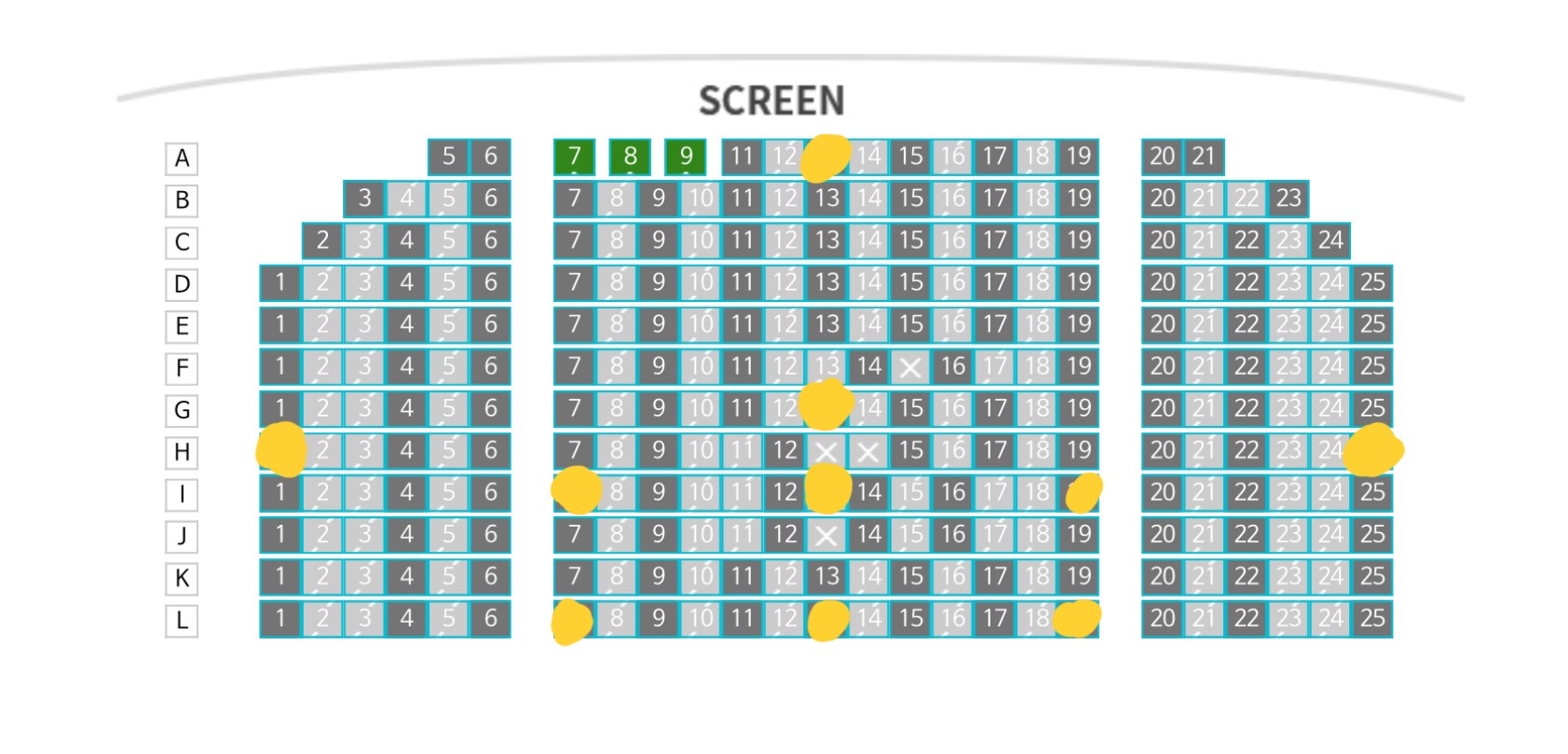 이번에 상영관 좌석별 시야를 기록한 좌석은 다음과 같습니다.