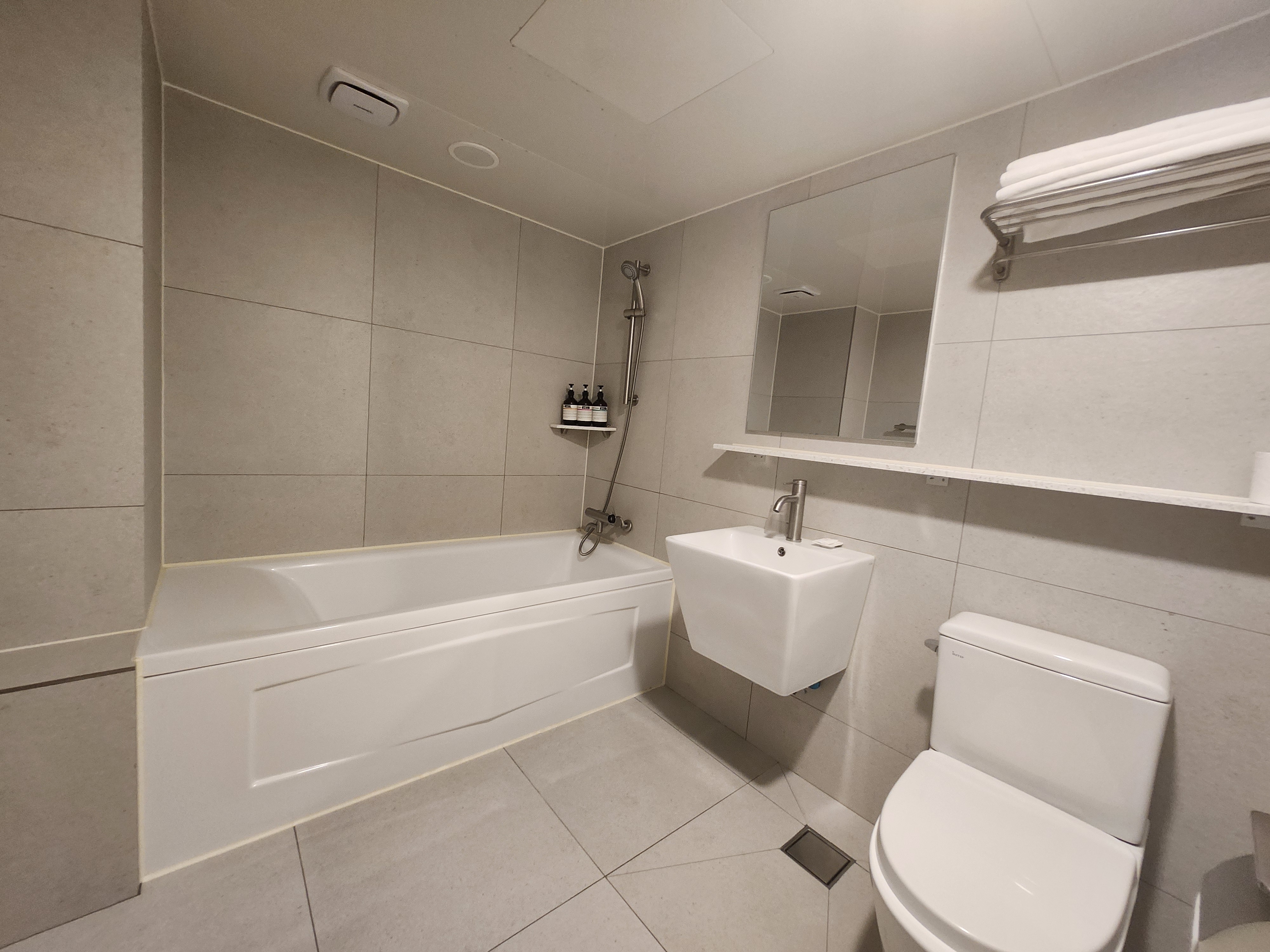 숙박을 하고 난 뒤의 소감을 정리하자면, 일단 방 크기가 넓은 점은 좋았습니다. 그리고 전반적인 방의 상태는 2022년에 지어진 신식 숙소인 만큼 괜찮았습니다. 다만 방에 있는 부대시설이나 어매니티가 좀 아쉬웠습니다. 대표적으로 기본적으로 지급되는 어매니티에서 뭔가 하나씩 빠졌습니다. 로션은 주지만 스킨은 없었고, 면도기는 주지만 면도 크림이나 젤은 없었습니다.