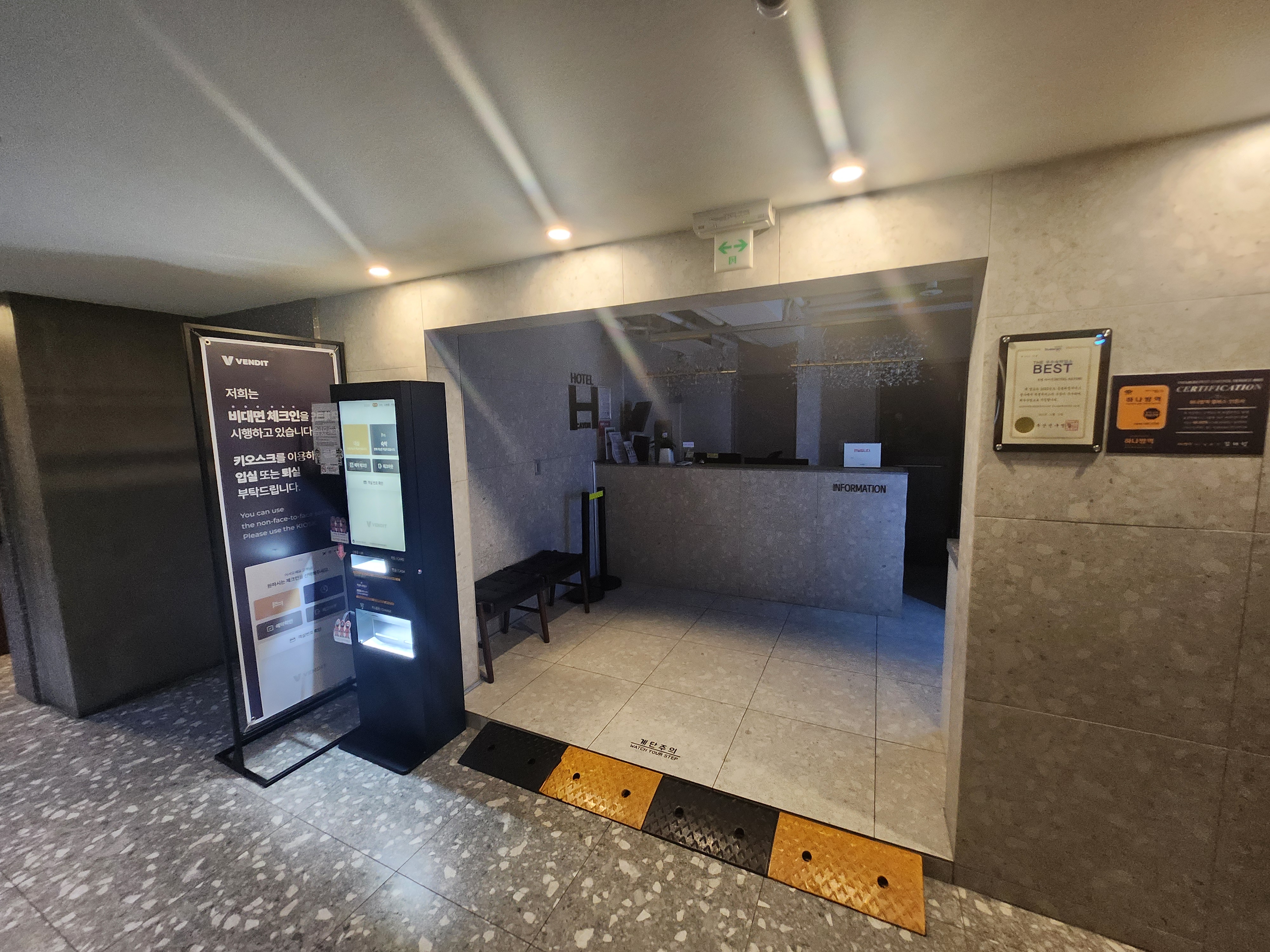만약 밤 늦은 시간에 체크인을 하신다면, 앞에 있는 키오스크 기기를 통해 예약자의 정보를 입력한 뒤