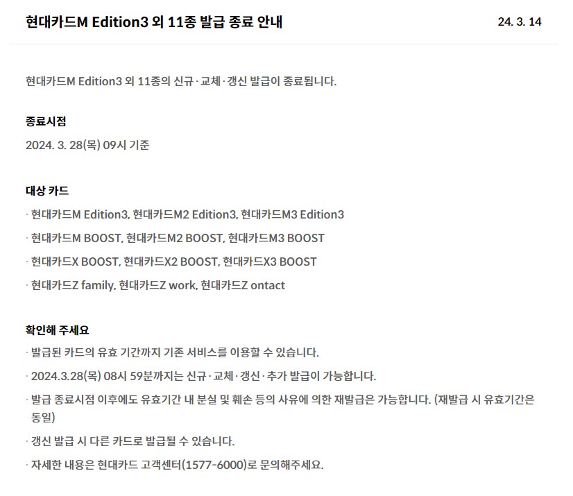 현대카드 - 3월 28일부로 M 시리즈, Z시리즈, M BOOST 시리즈, X BOOST 시리즈 단종(발급중단)정보 2024. 3. 19. 13:30반응형