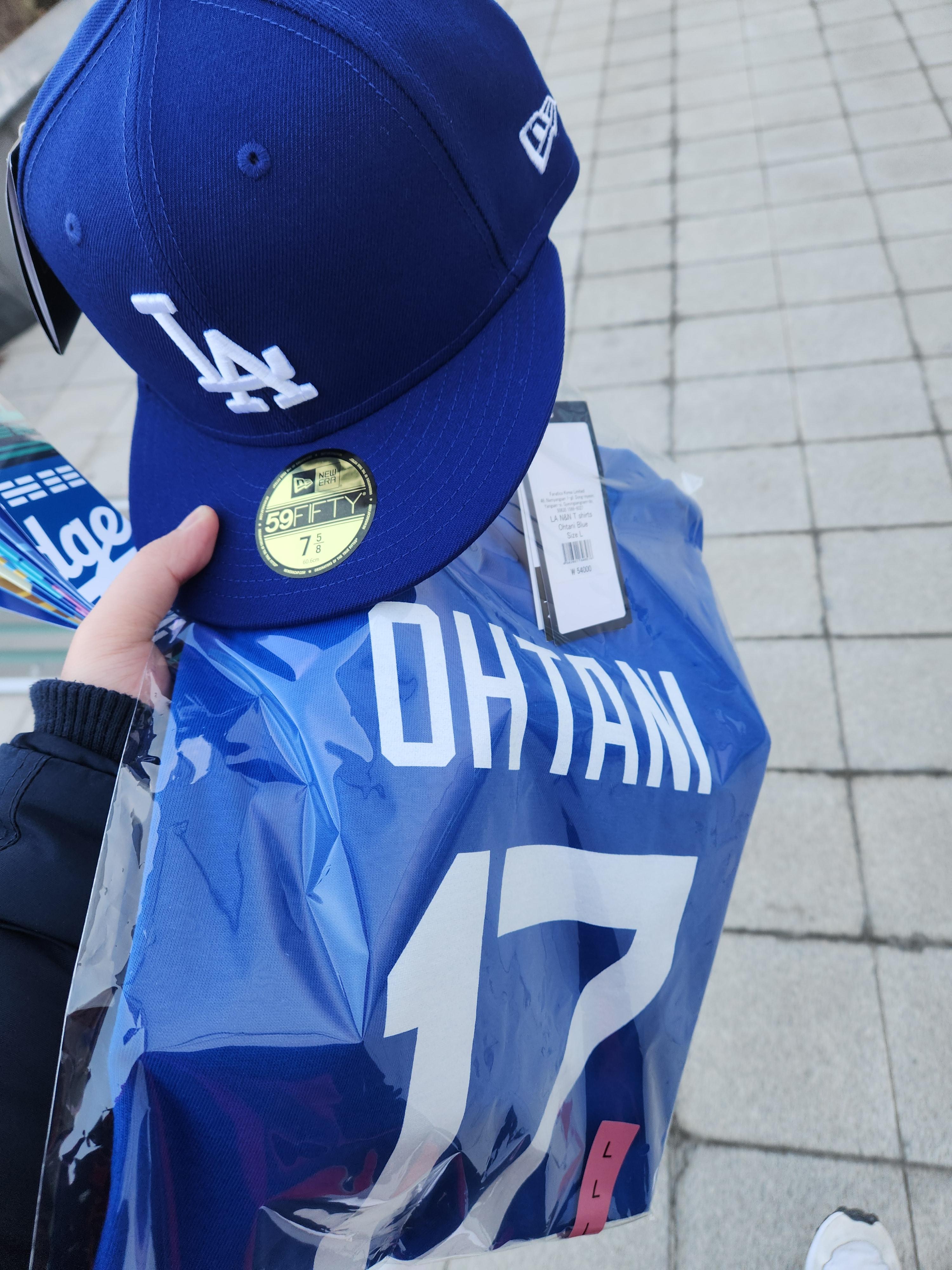 하는 수 없이 구매한 모자와 오타니 셔츠 라지 사이즈. 티셔츠는 제가 입기엔 다소 사이즈가 작으니 주변 지인에게 선물로 줘야겠습니다.