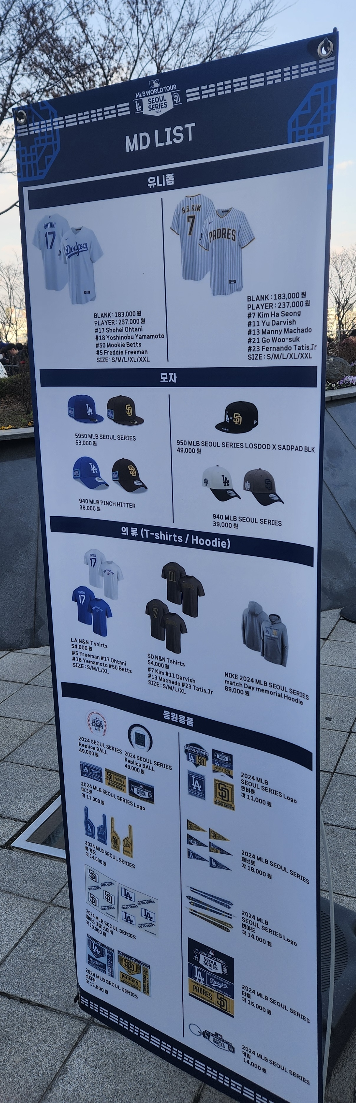 목요일 경기날에는 재고가 얼마나 남아있을지 모르겠습니다만, 개막전 수요일의 경우엔 이미 오후 3~4시 사이에 오타니 유니폼은 전부 매진이었습니다. 5만 4천원짜리 티셔츠도 XXL사이즈가 오후들어서 먼저 매진이 되었지요. 김하성 선수의 유니폼 역시 매진이었고 셔츠도 비슷한 상황이었습니다.