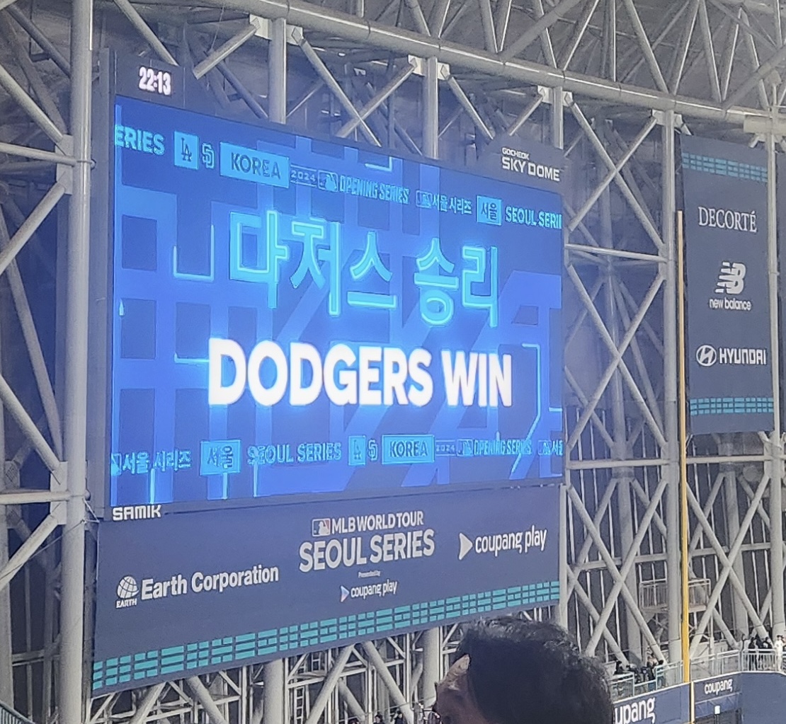 그 이후 전설적인 선수 박찬호 선수의 시구가 있었습니다. 한국에서 열리는 첫 MLB 공식 경기의 시구를 박찬호선수가 하고 그걸 김하성선수가 받는다는 점에서 상당한 의미가 있었습니다. 그 이후에 펼쳐진 경기 결과는 중계에서 볼 수 있듯이 다저스가 8회에서 크게 득점하며 5:2로 승리했습니다.