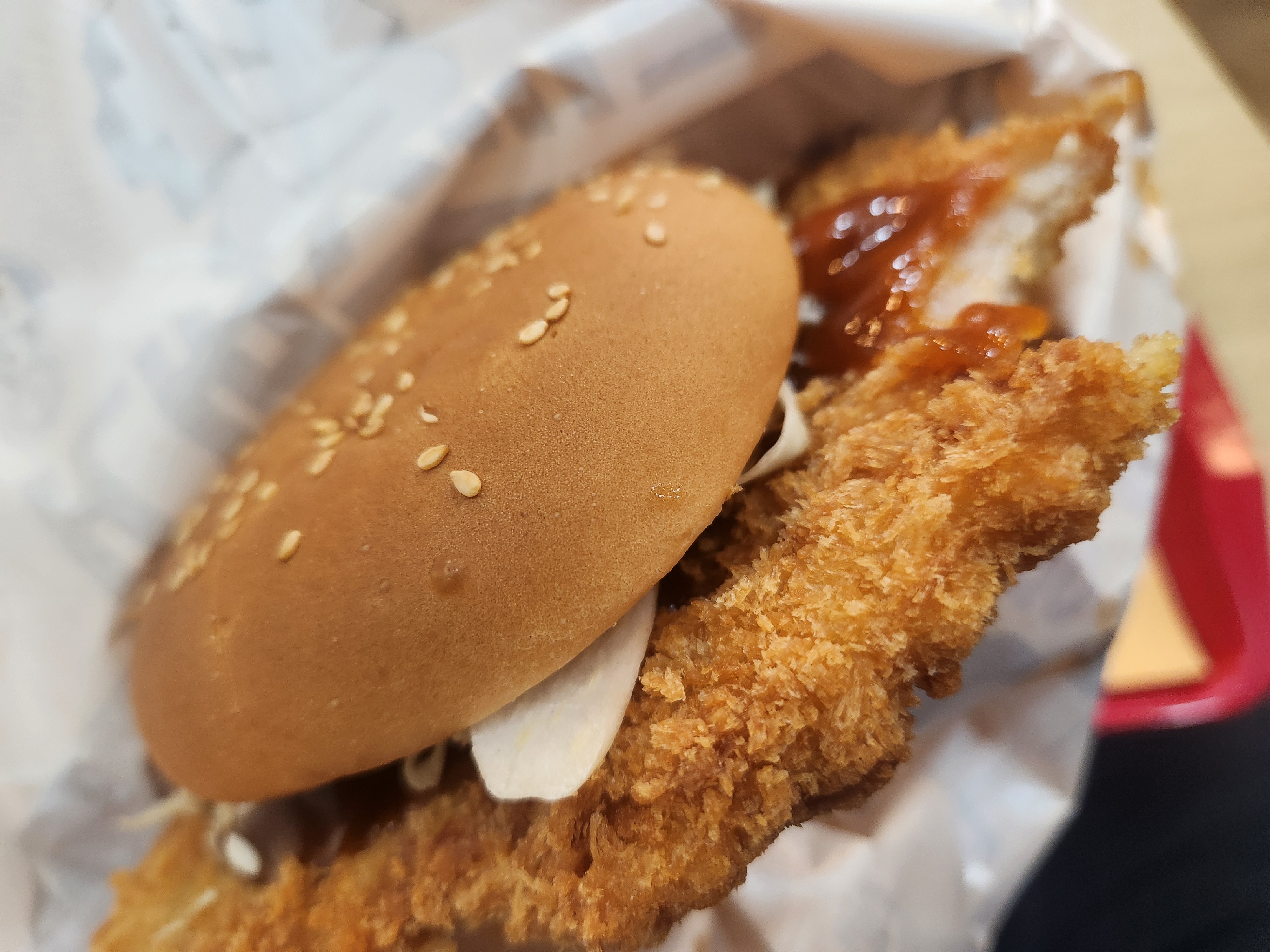 조금 애매한 면이 있습니다. 그냥 버거와 비교하면 크기가 좀 커서 먹기가 살짝 힘든 면이 있고, 그냥 돈가스와 비교하면 크기가 다소 작고 소스가 좀 아쉬운 느낌입니다. 양으로 봐도 일반 돈가스와 비교할 때 좀 적은 느낌이지요. 같이 나오는 밥 대신 빵으로 바뀌고 샐러드가 그냥 버거 야채로 들어간 느낌이니까요. 하지만 두 메뉴를 같이 먹는다는 의미를 좀 더 둔 버거입니다.