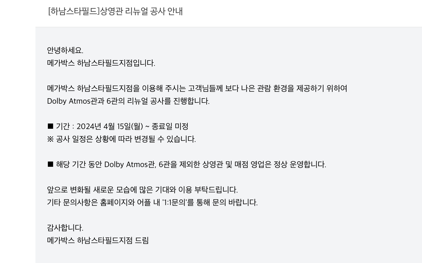 2024년 4월 12일 금요일에 메가박스 하남 스타필드 지점에 공지사항이 하나 올라왔습니다.