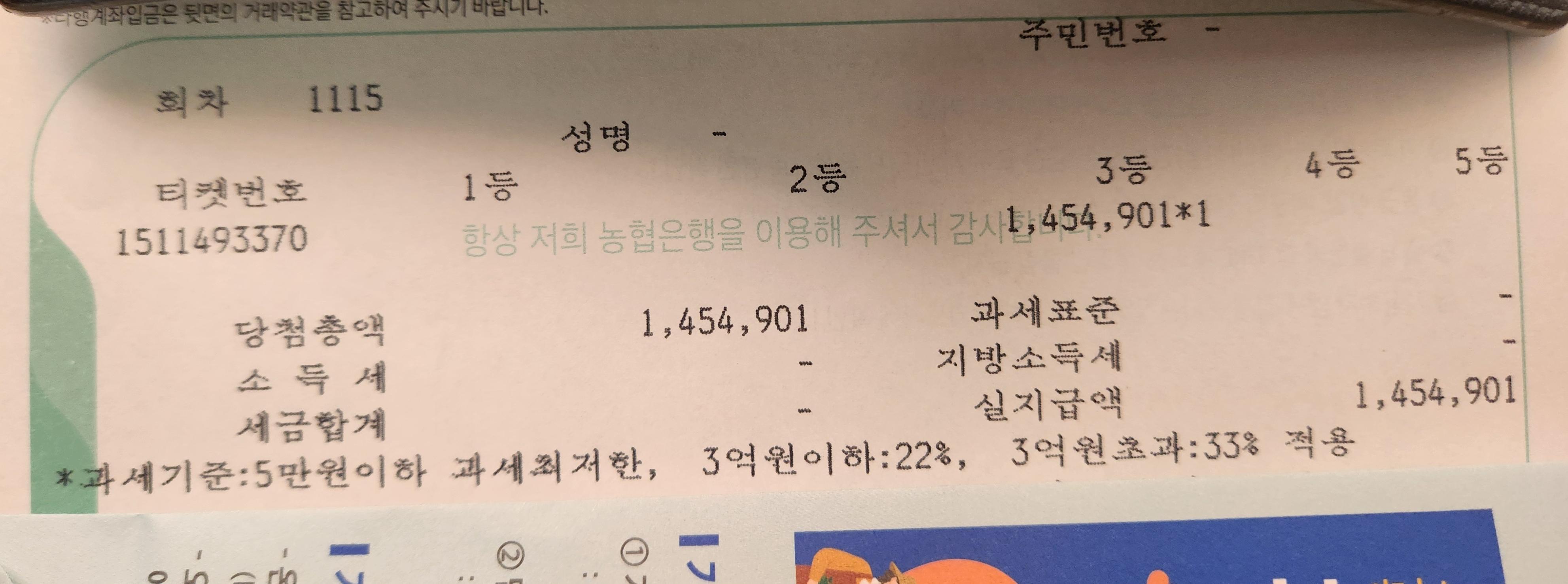로또 3등은 대체로 당첨금이 200만원이 넘는 경우가 거의 없기 때문에 온전히 당첨금 전부를 수령 할 수 있었습니다.