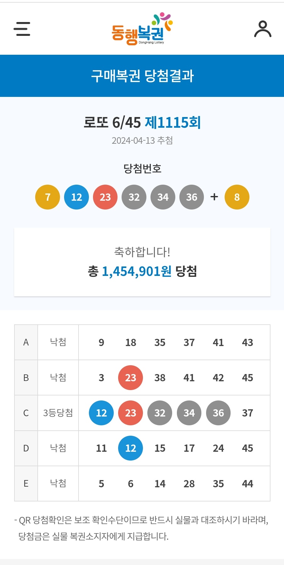 글쎼 번호 5개가 맞아들어갔고, 3등에 당첨되었다는 글이 떴습니다.