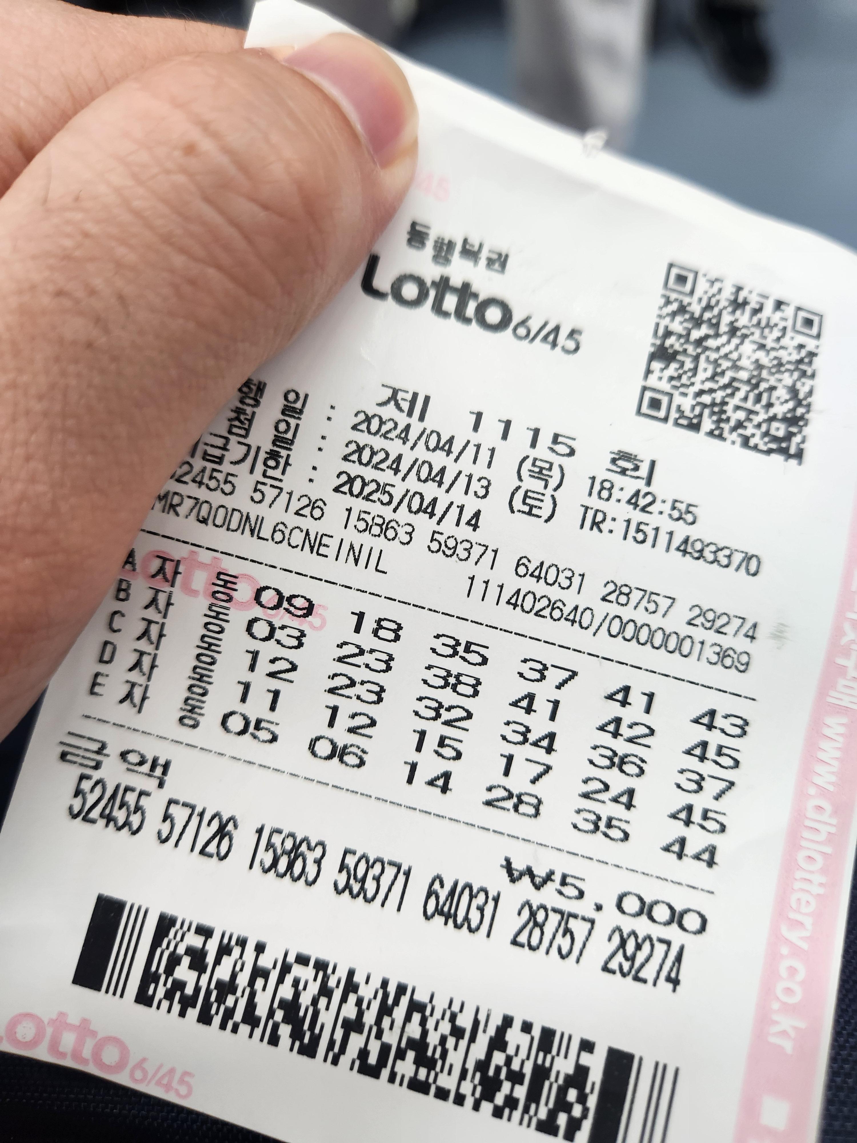 기쁜 것도 있었지만 또 다른 면에선 아쉬움도 있었습니다. 5개 번호가 맞아 3등이 확정된 순간, 나머지 40개의 번호 중 2개만 맞으면 2등 또는 1등이었는데 40개 중에서의 2개, 즉 5%의 확률엔 미치지 못해 3등이 되었다는 것을 생각하니 좀 아쉽긴 했습니다.