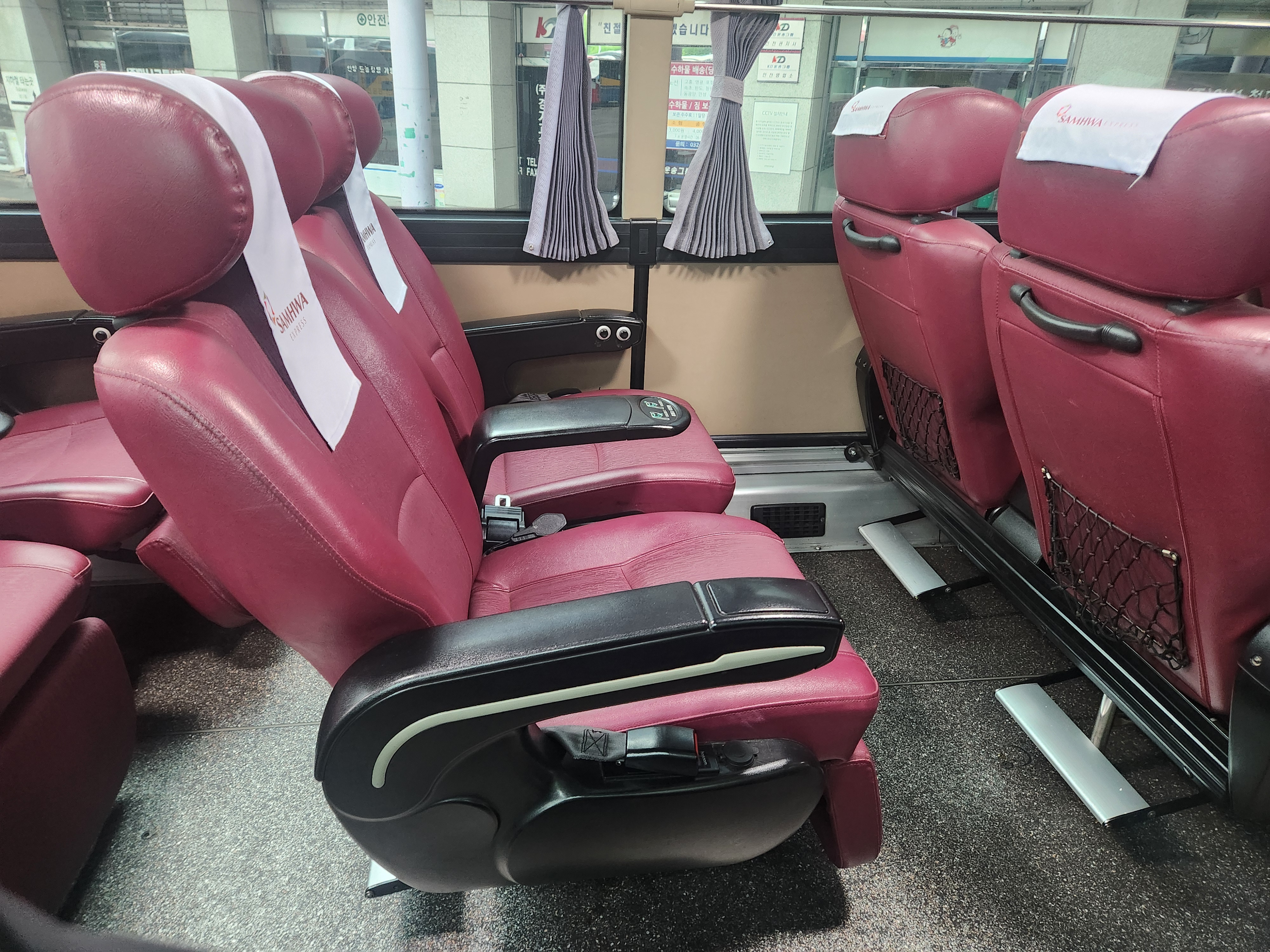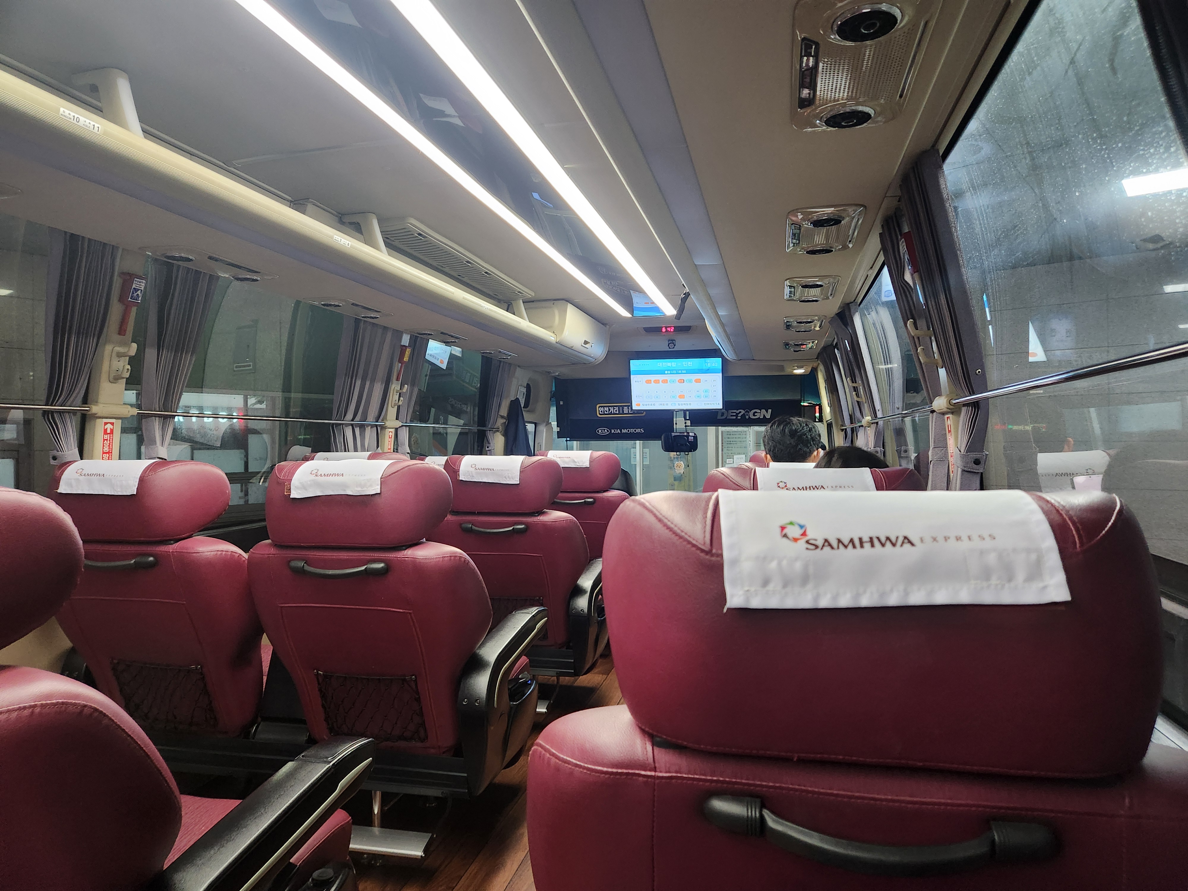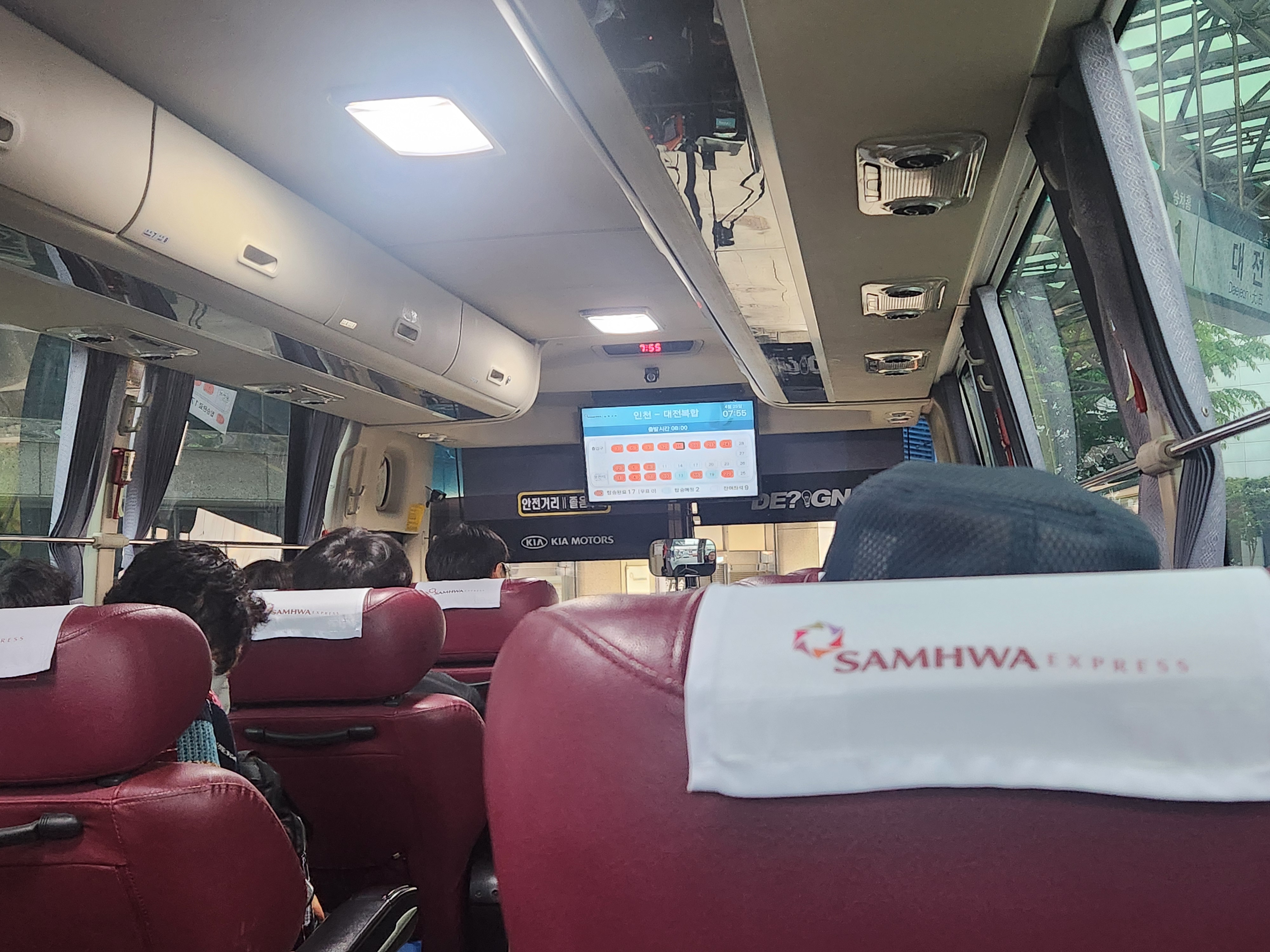 대전가는 버스. 전날 탄 우등버스 의자와 큰 차이는 없었습니다만 시트의 색이 붉은색 계열인 차입니다.