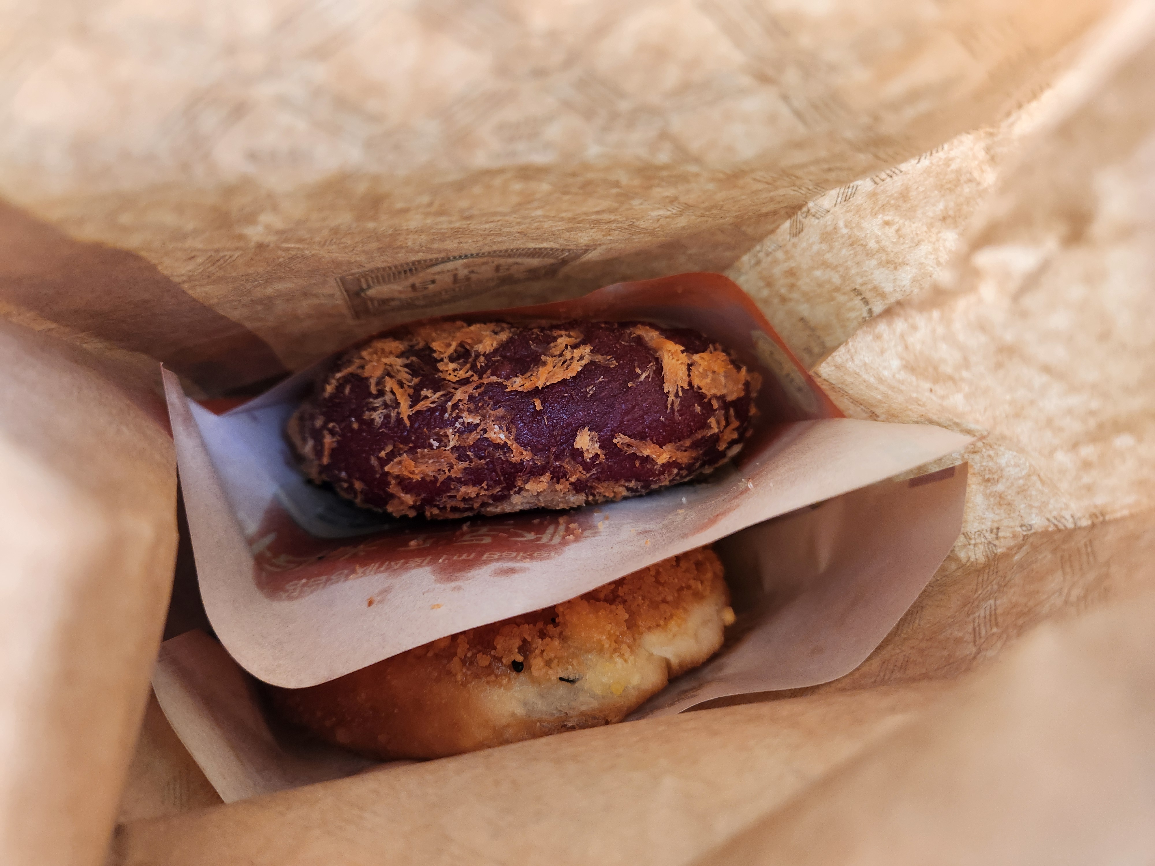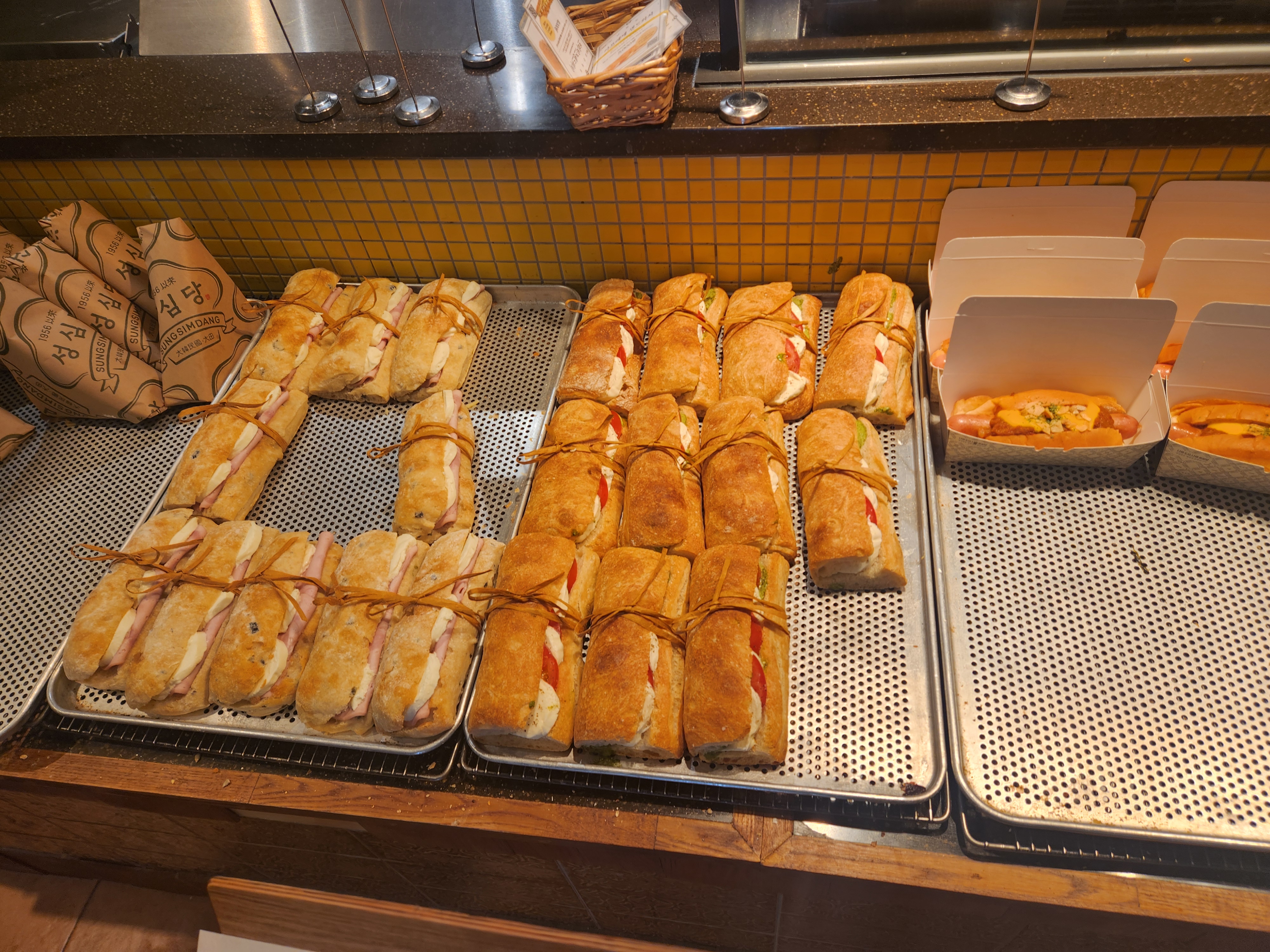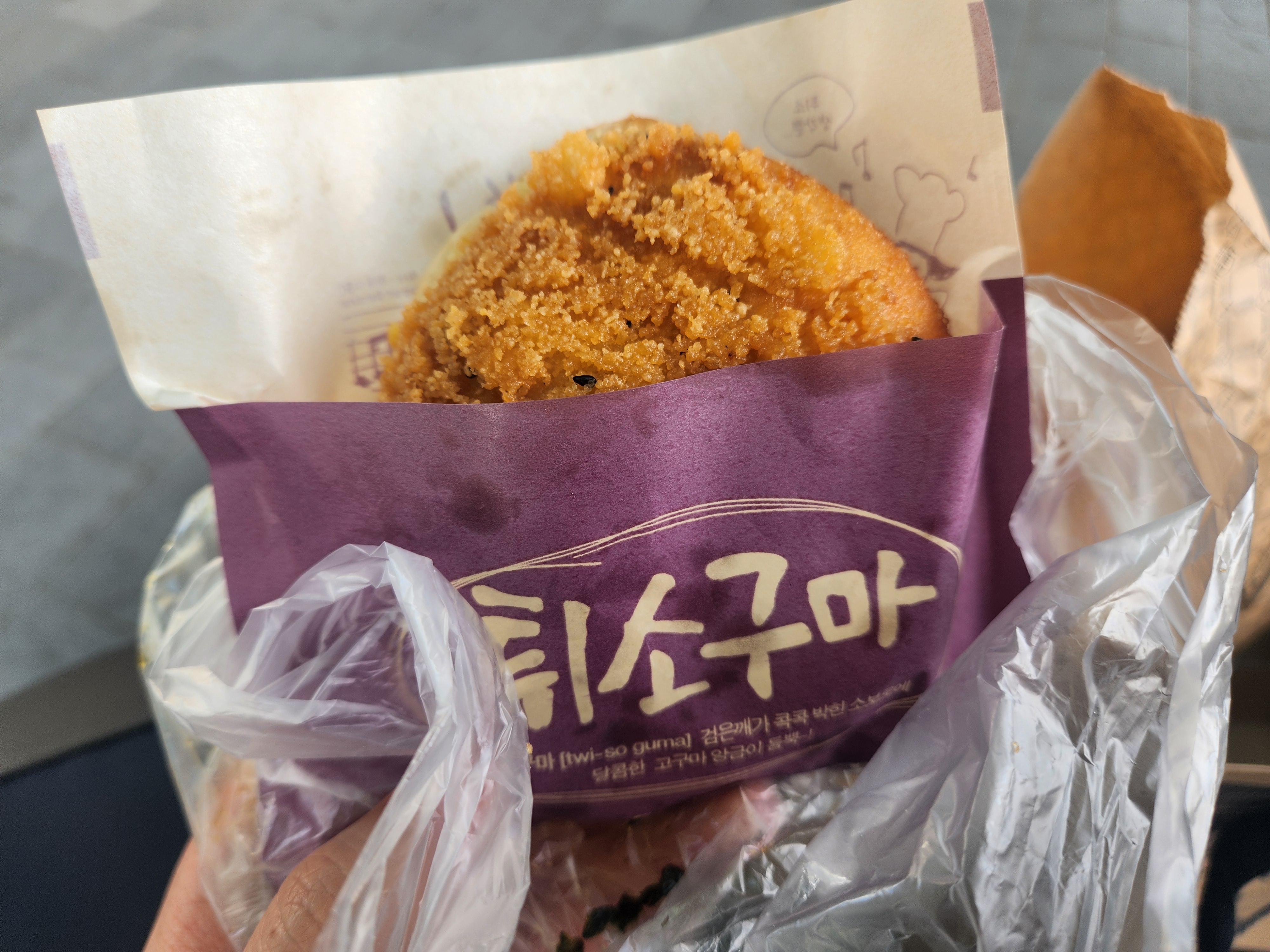 여러 빵이 있어서 뭘 먹어야 할 지 오히려 선택을 못하고 빙빙빙 돌아다니다가 결국은 허기진 배를 좀 채우고자 김치찹쌀주먹밥과 튀소구마, 마라미 고로케를 바로 먹을 용도로 구매했고, 튀김소보루와 튀소구마가 각각 6개씩, 총 12개가 들어간 형제더블세트를 구매했습니다.