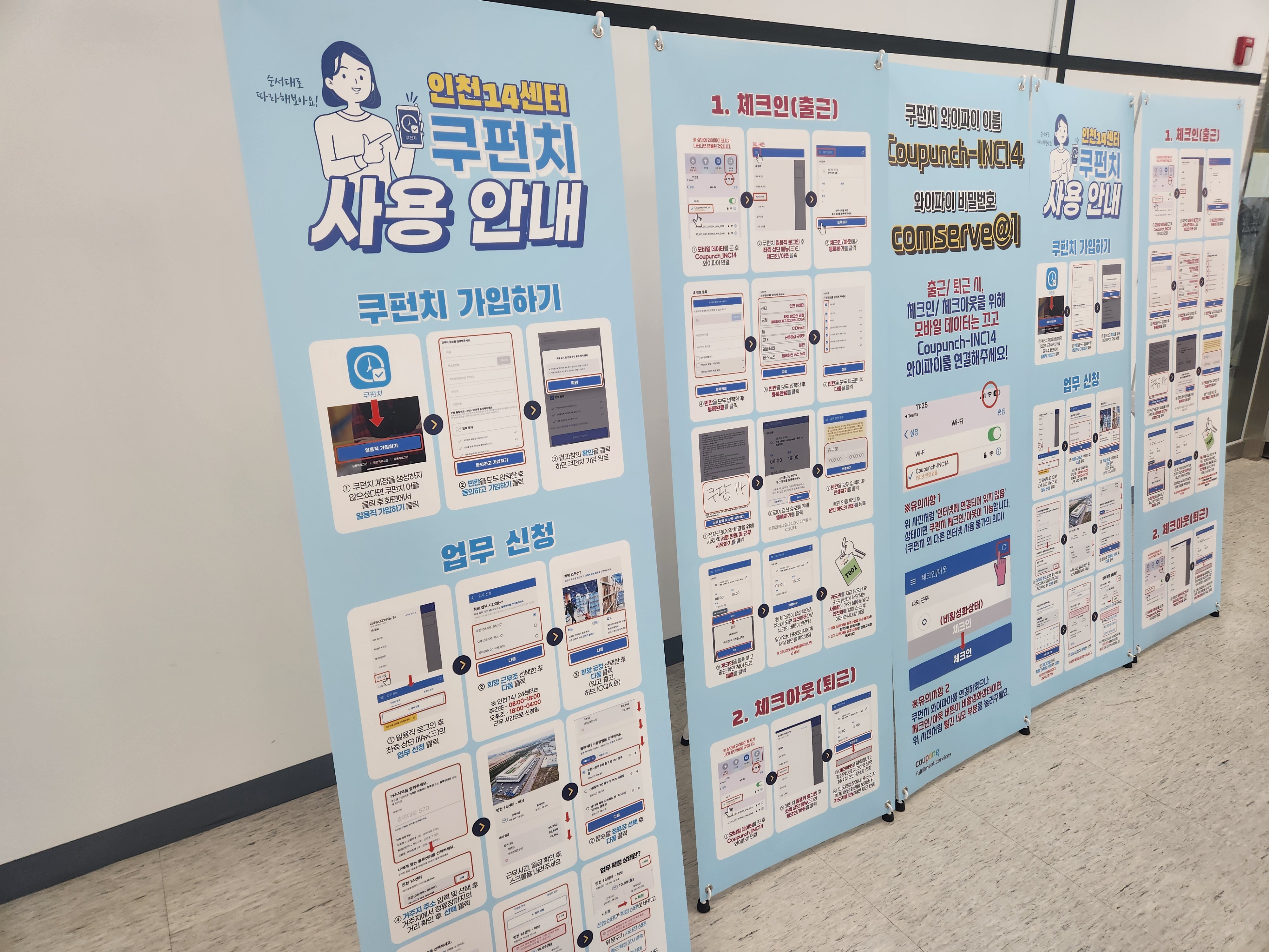 저는 계약직이 아닌 단기 일용직이기 때문에 9층 단기인접장에 왔고, 여기서 쿠펀치 앱을 통해 업무 신청, 체크인 과정을 거쳤습니다.