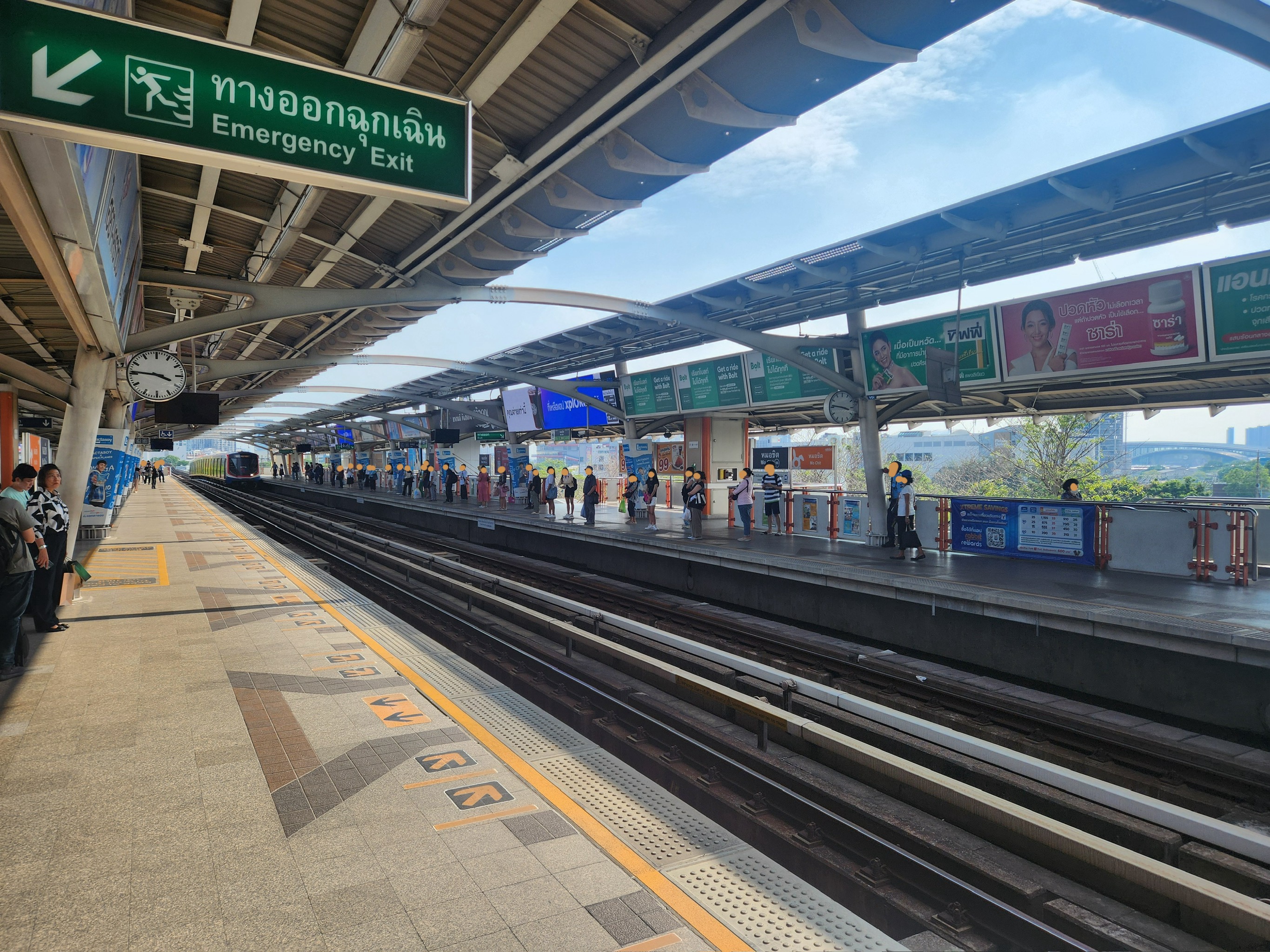 BTS철도노선은 지상전철입니다. 고가철도 같은 개념입니다. 역도 외부에 그대로 노출되어 있어서 역은 상당히 덥습니다. 다들 그늘에서 열차를 기다리고 있는 모습입니다. MRT와는 달리 BTS는 일부 역에만 스크린도어가 있는 것 같습니다.