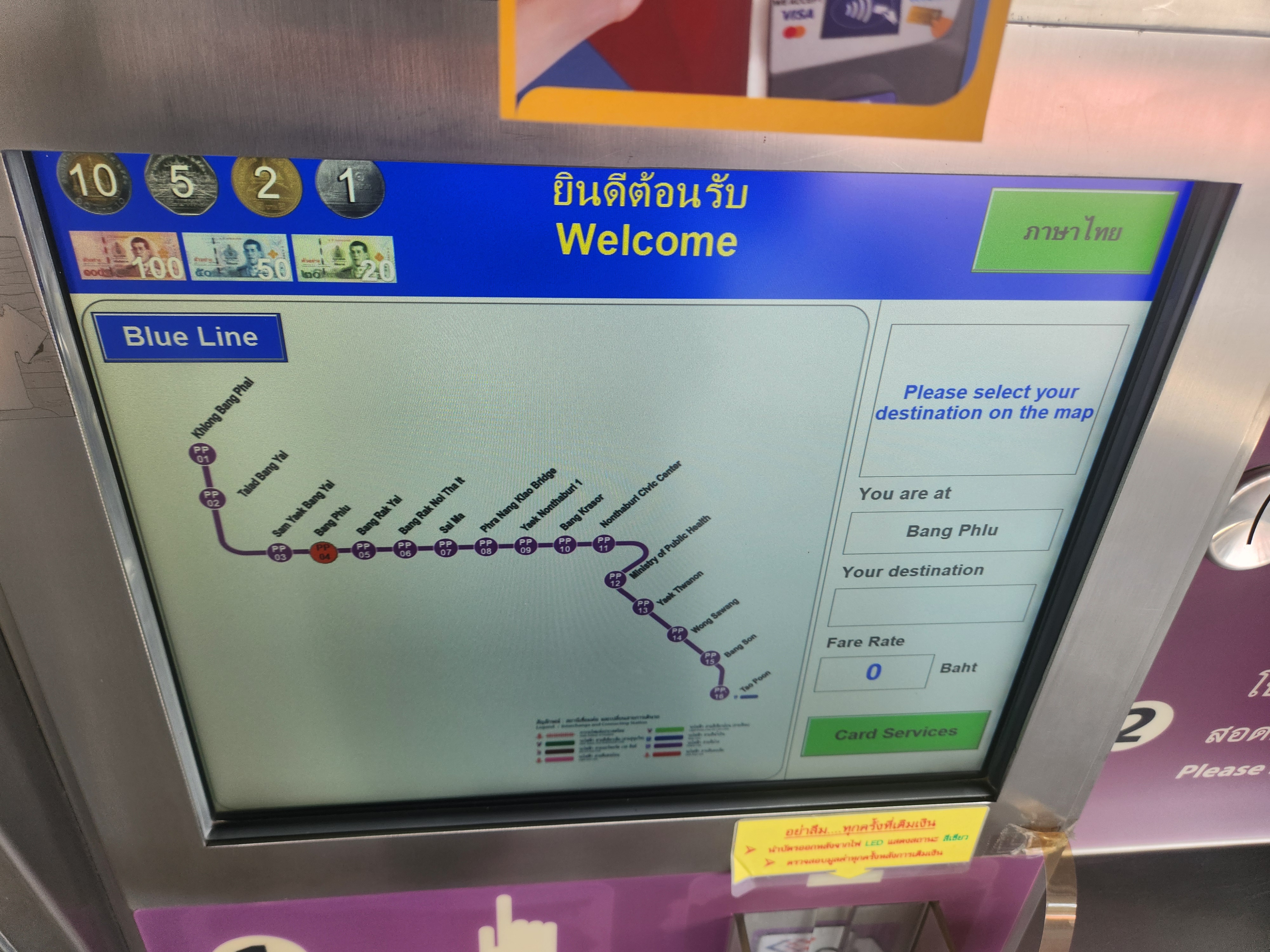 출발지인 MRT퍼플라인의 방 플루역에서 MRT블루라인의 쑤언 짜뚜짝 역으로 입장권을 살 수 있습니다.