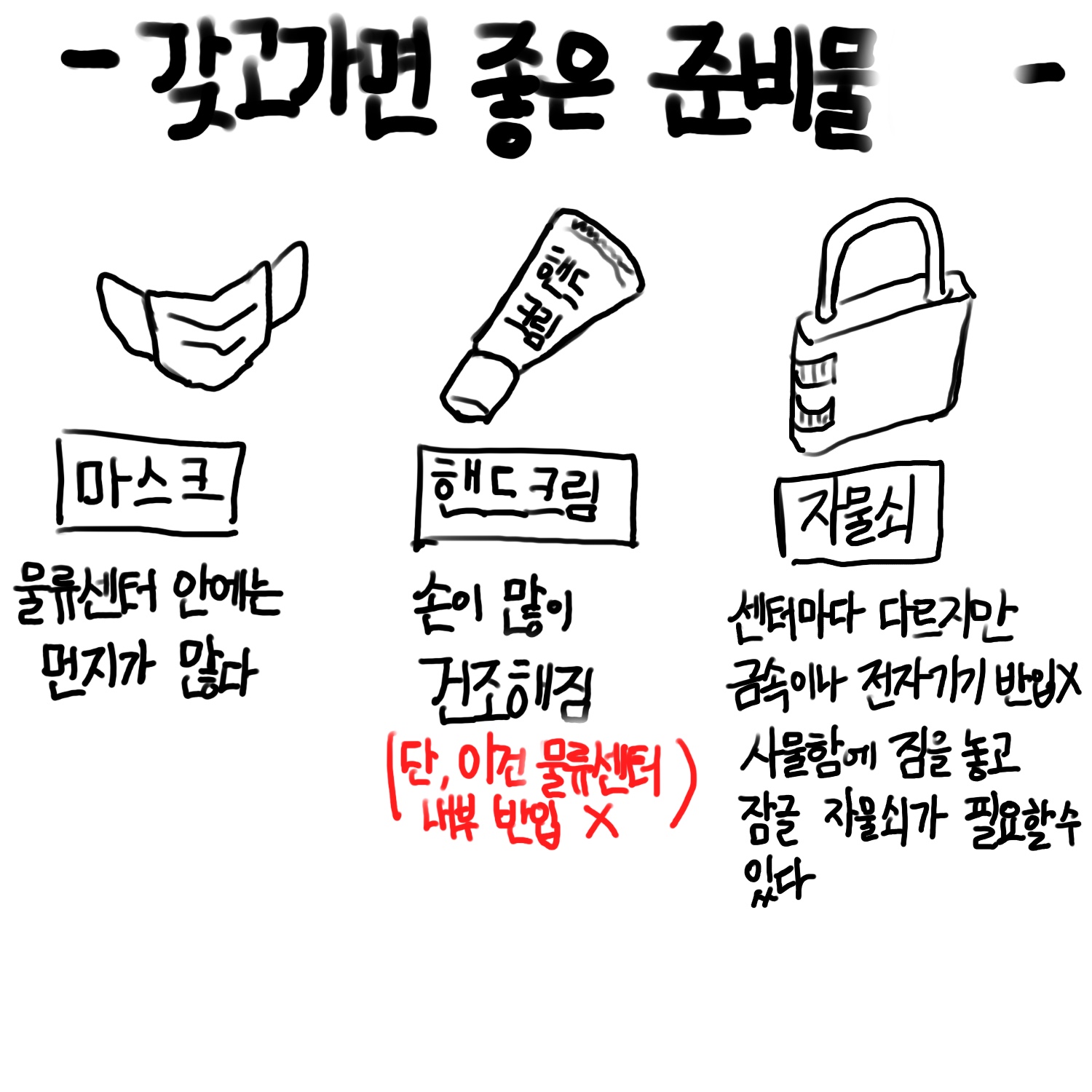 자물쇠 : 중요합니다. 센터마다 지급이 되는 곳도 있긴 합니다만, 물류창고에선 금속류나 전자기기 반입이 안되므로 사물함에 보관하는데 이 때 필요합니다.