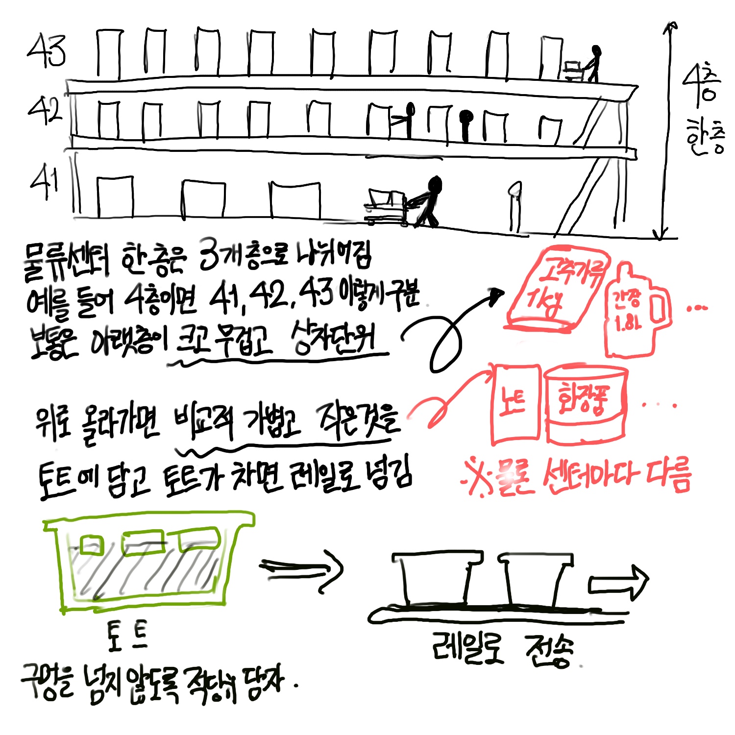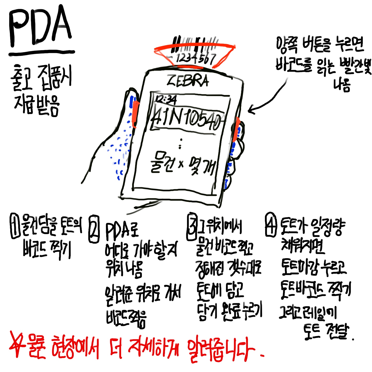 물류창고에서 PDA가 알려주는 위치로 가고, 지정된 물건의 바코드를 찍고 정해진 갯수대로 토트에 담고 레일로 토트를 넘기면 됩니다.