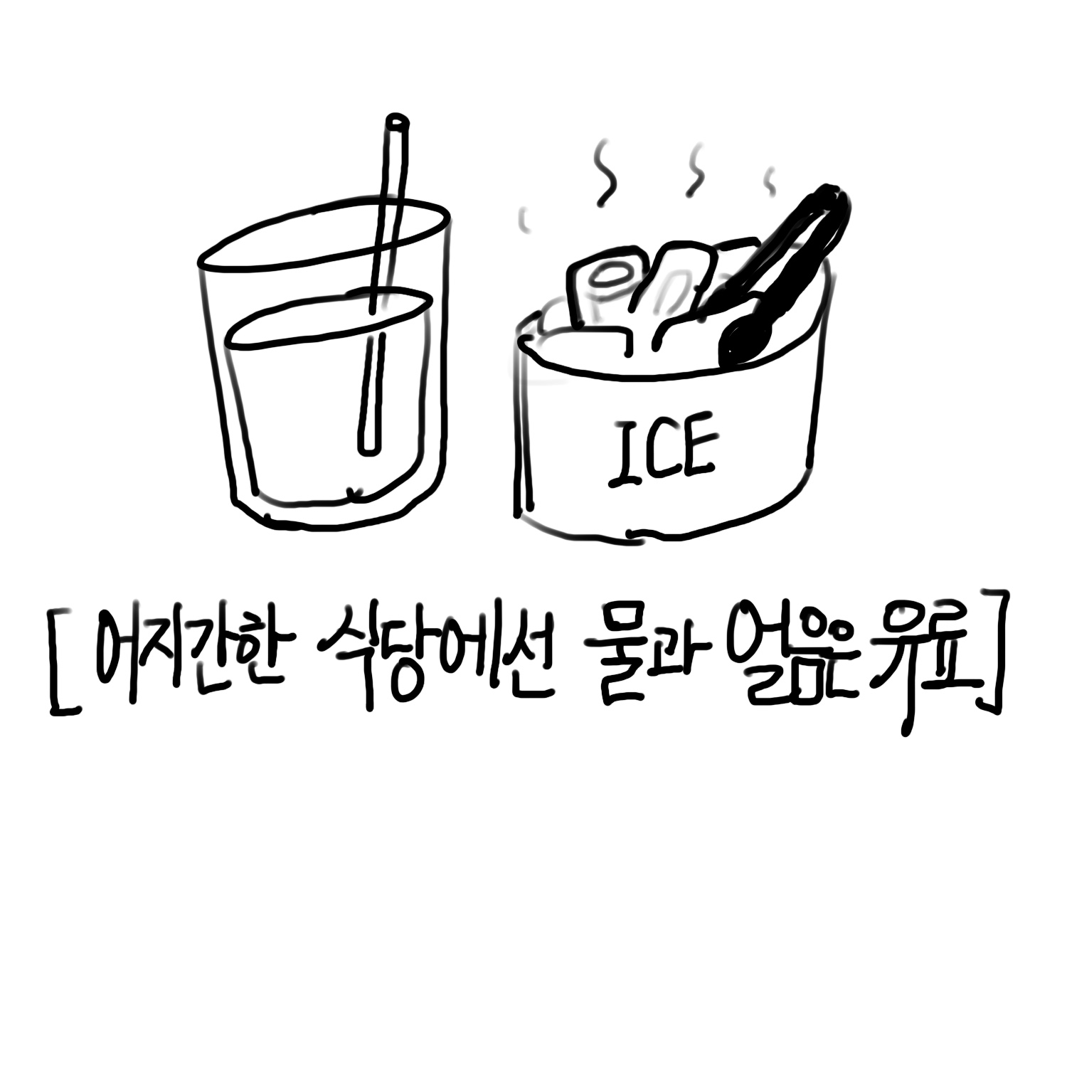 보통 미지근한 물통 하나와 얼음 여러 개가 담긴 큰 그릇 이렇게 나오고 각각의 잔에 얼음을 채우고 물을 붓고 각자 플라스틱 빨대를 꽂아 물을 마시는 형태입니다. (참고로 태국은 아직도 플라스틱 빨대를 사용합니다.)