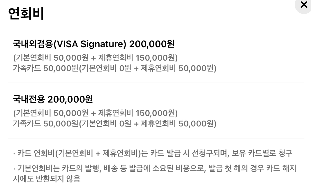 가장 먼저 눈에 들어오는 변화는 연회비가 기존 15만원에서 5만원 더 올라 20만원이 되었습니다.