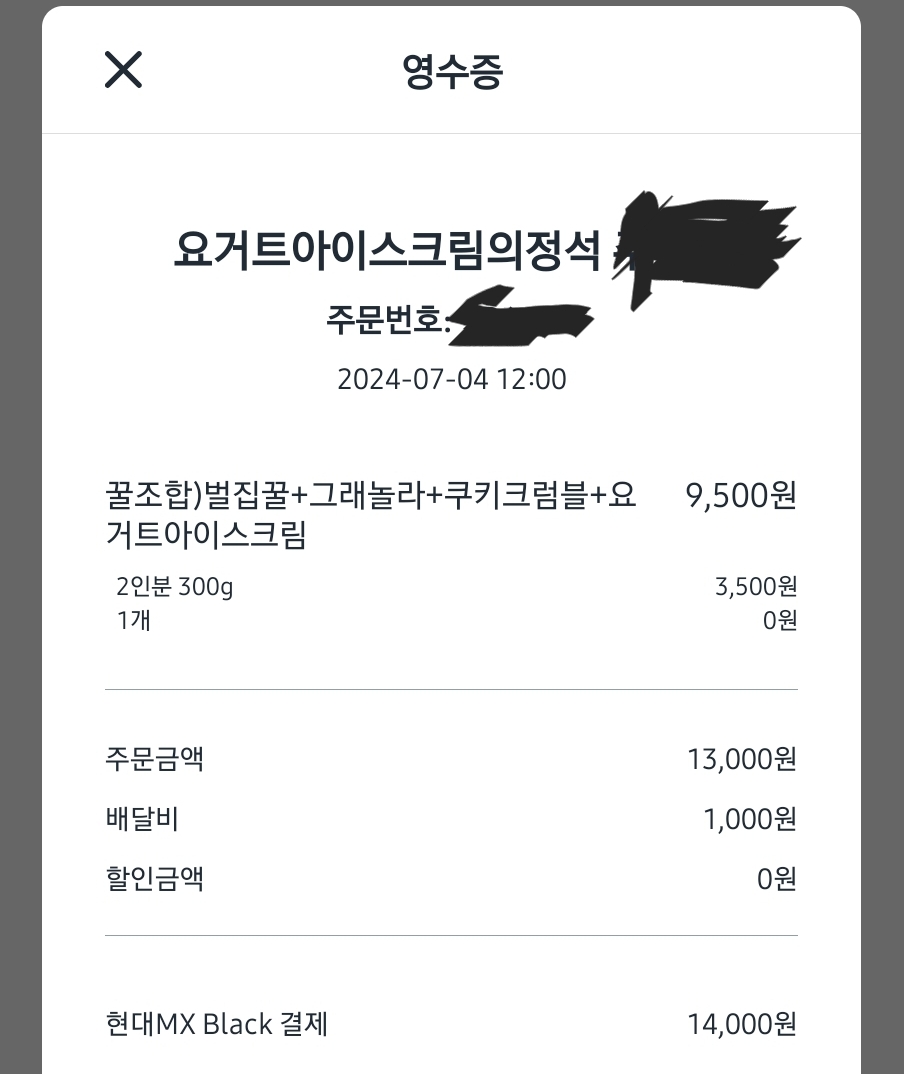 여기에 배달료 1천원이 추가되어 총 1만 4천원을 결제하였습니다.
