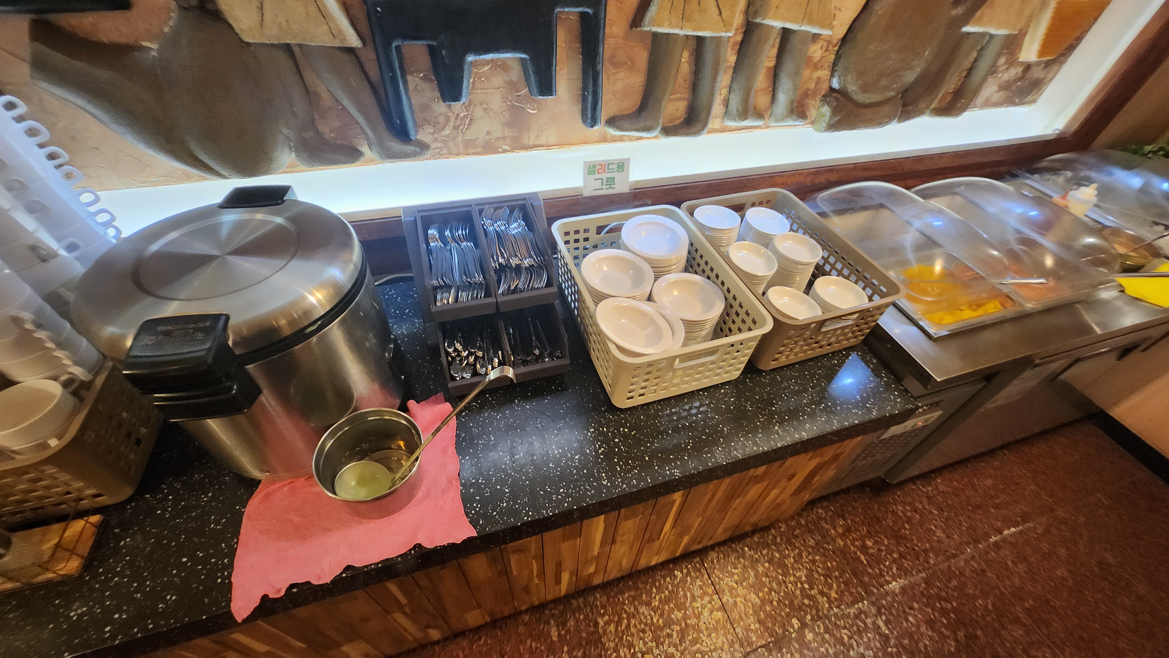 이 곳은 반찬과 샐러드, 완두콩으로 만든 크림스프, 탄산 음료수(코카콜라와 스프라이트, 환타만 있습니다.)가 셀프로 마음껏 먹을 수 있습니다.