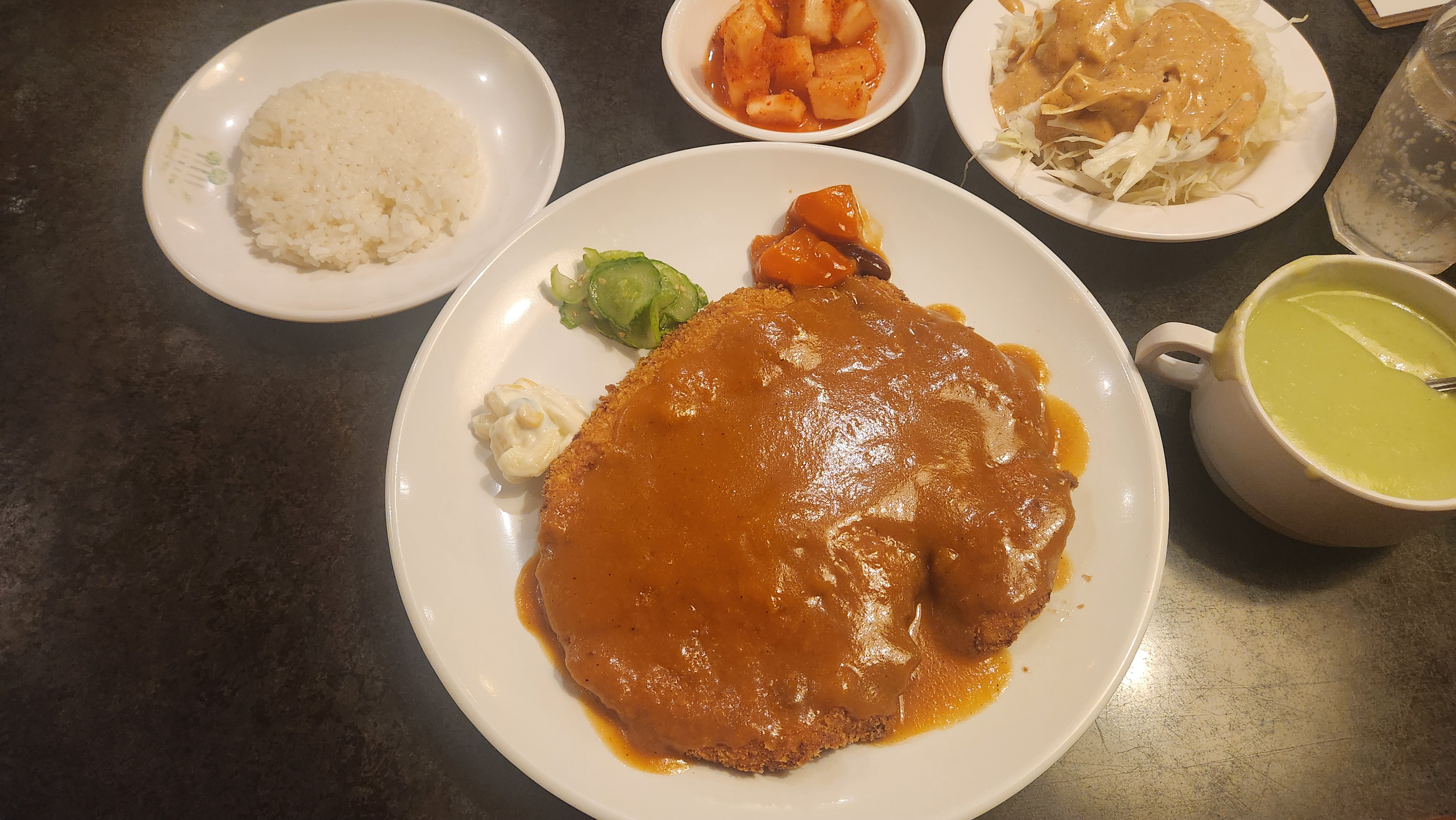 참고로 돈까스를 시키면 밥과 빵 중에서 하나 고르라고 하는데요, 저는 이 날 밥을 골랐습니다.