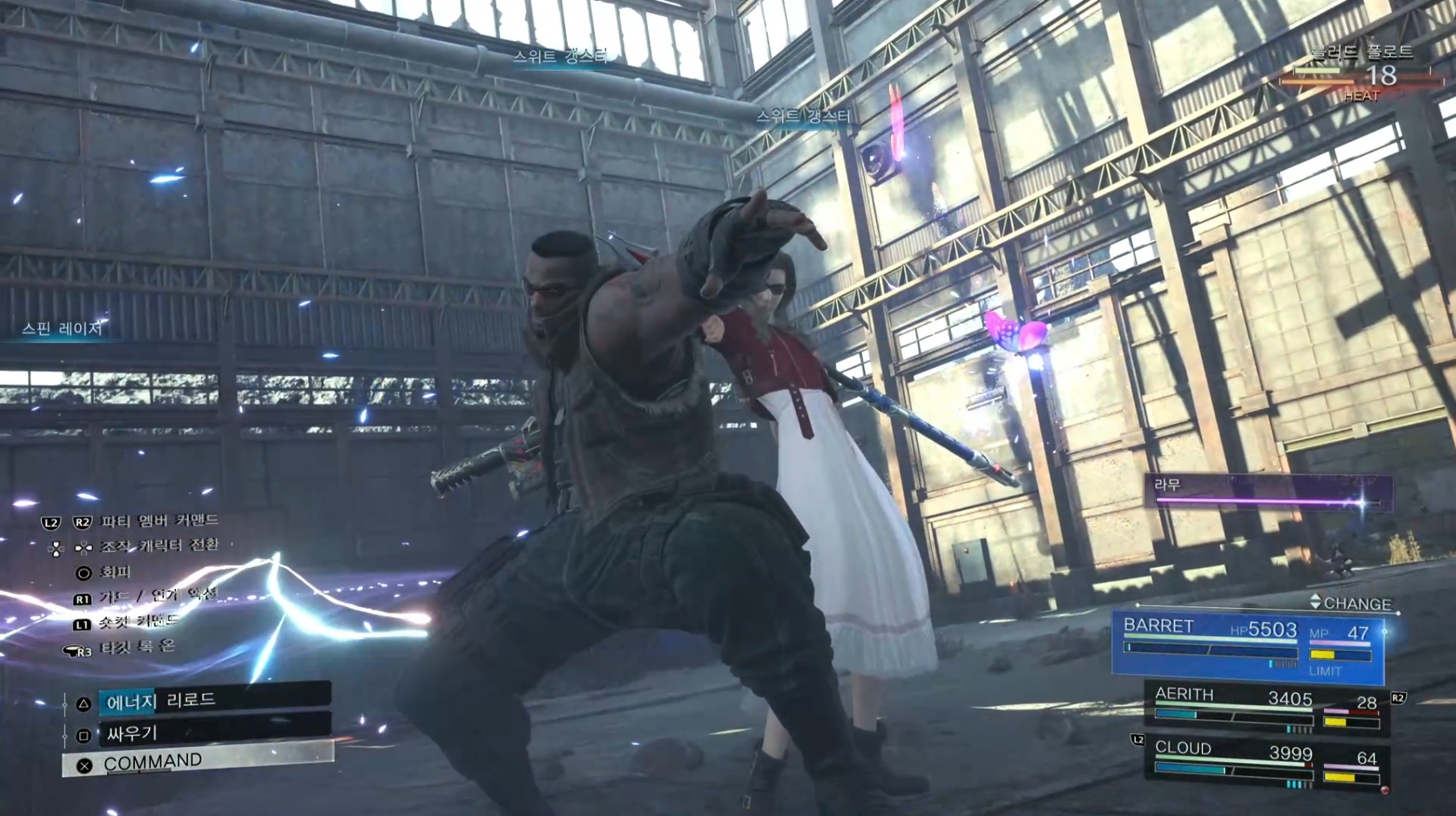 다만 이번엔 클라우드를 포함해 최대 3명의 동료들만 파티로 묶을 수 있습니다. 대신 여기에 한 가지 추가된 게 있는데 바로 ‘연계기술’입니다. 각각의 캐릭터들이 어빌리티 능력을 사용하면 체력게이지 밑에 또 다른 게이지가 한 칸씩 채워지게 되는데요,
