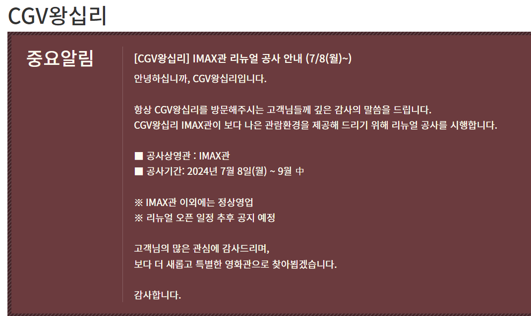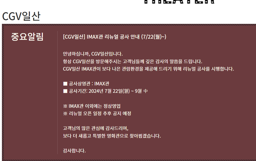 그리고 7월 22일 월요일부터는 일산 아이맥스관도 리뉴얼 공사가 진행이 될 예정이라고 합니다.
